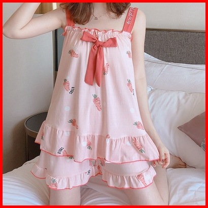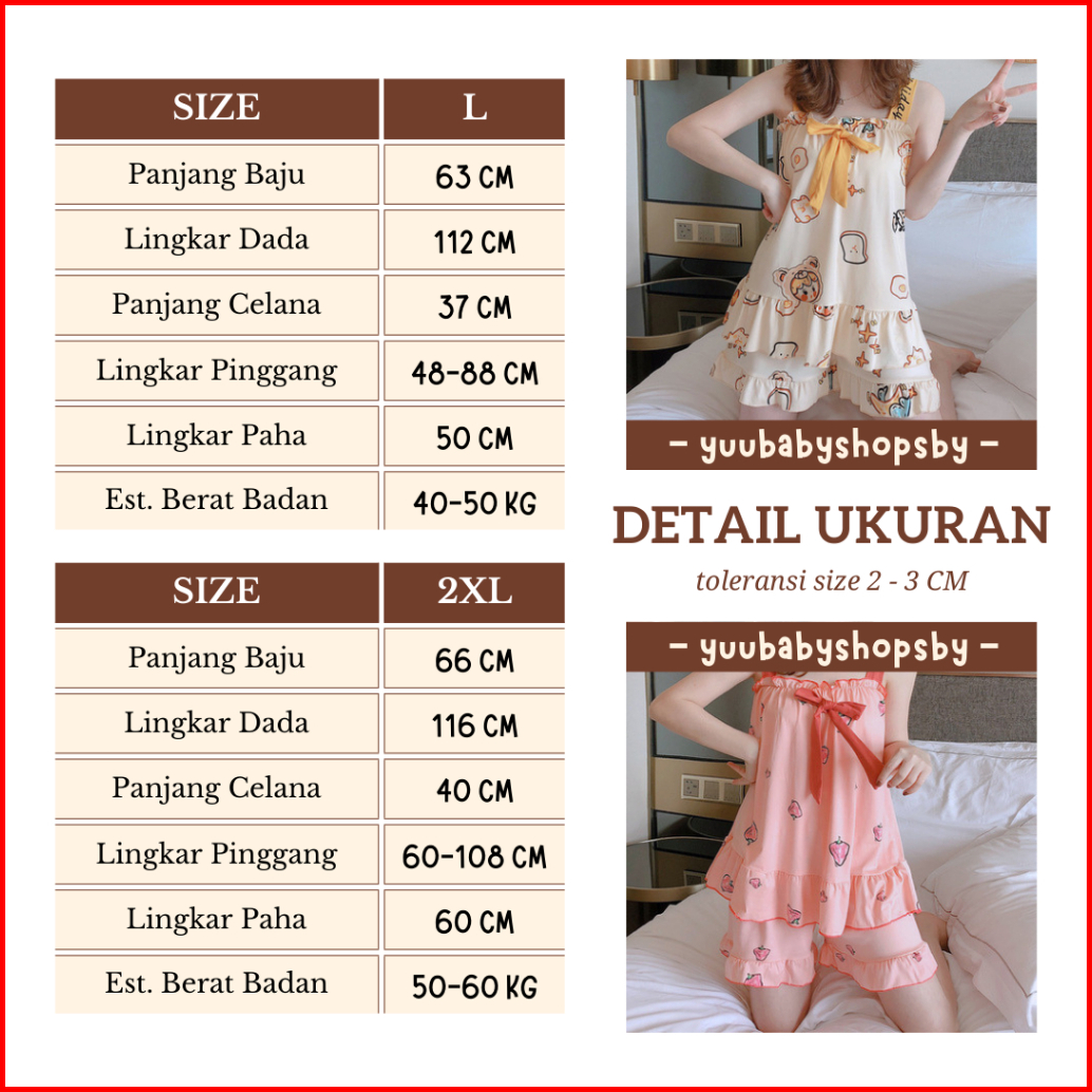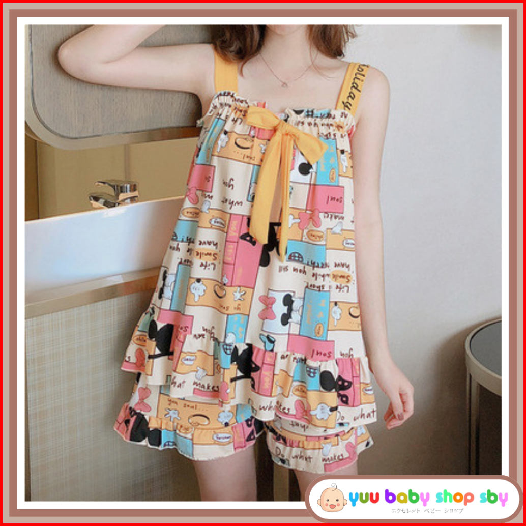 Ybss Setelan Baju Tidur Wanita Dewasa Lengan Kutung Celana Pendek Bahan Katun Polyester Adem Licin Serap Keringat Motif