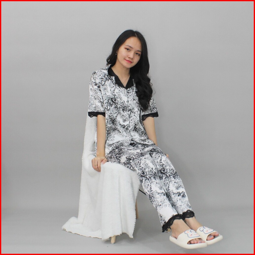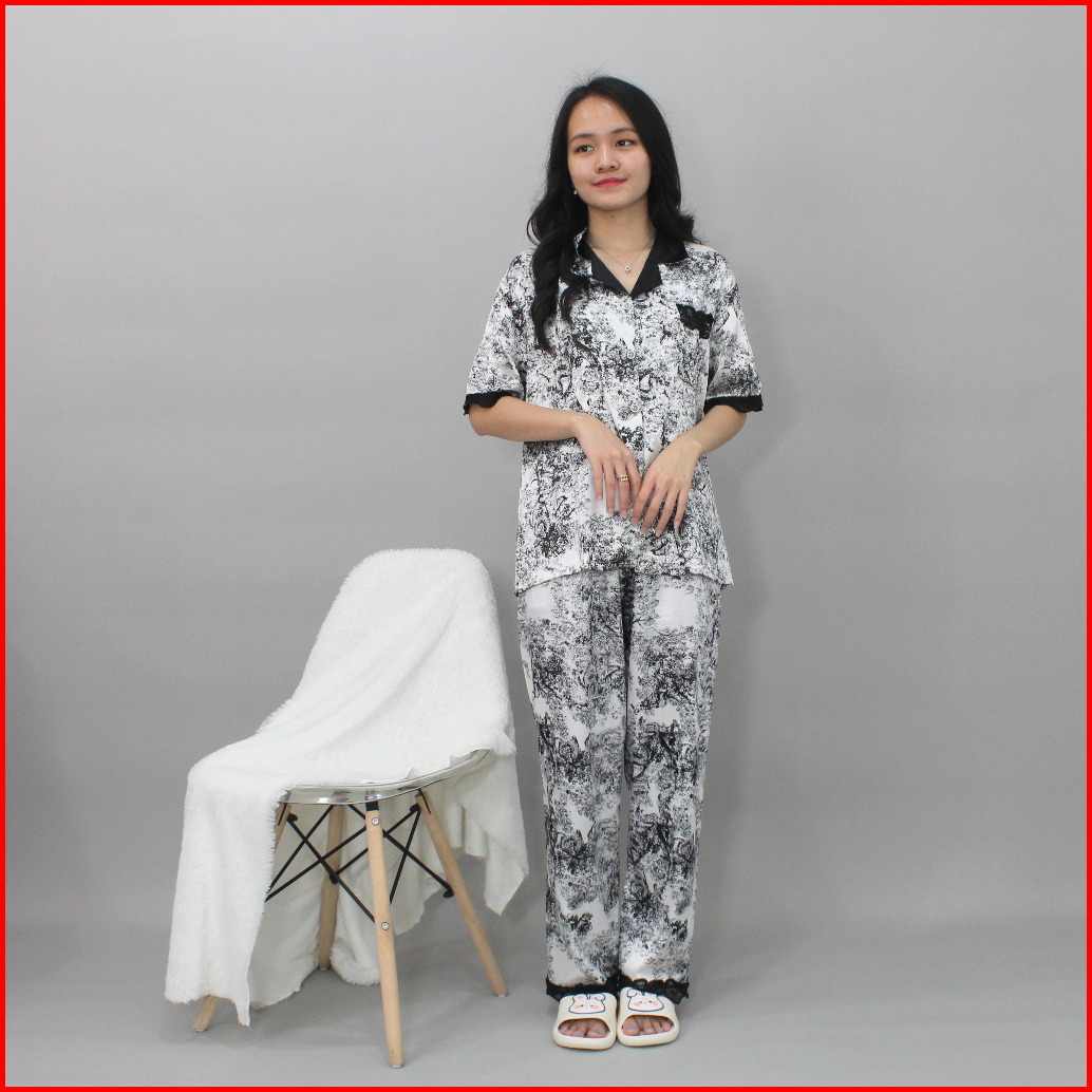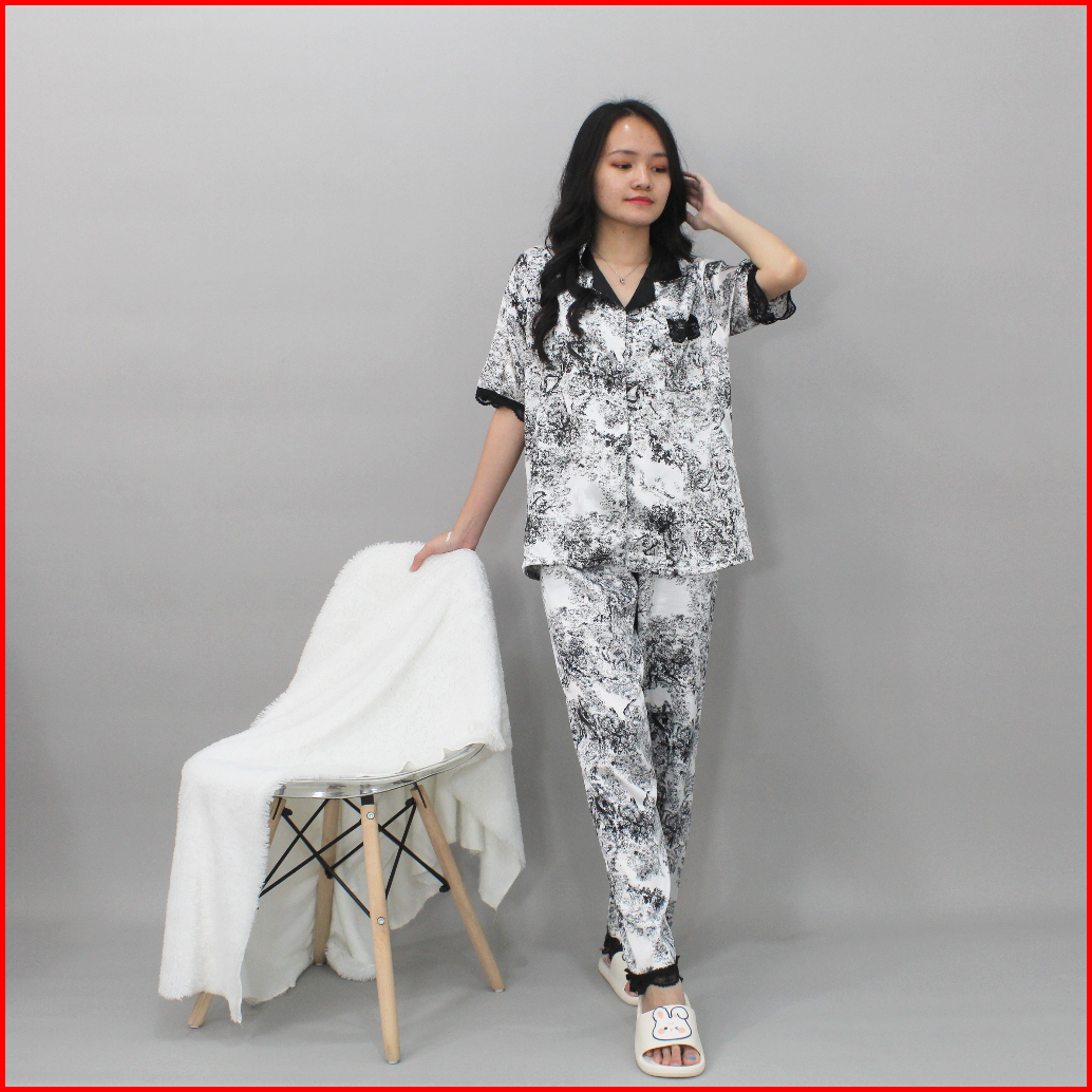 St20 Viera Piyama Motif Hitam Putih Bahan Satin Lengan Pendek Celana Panjang Baju Tidur Dewasa