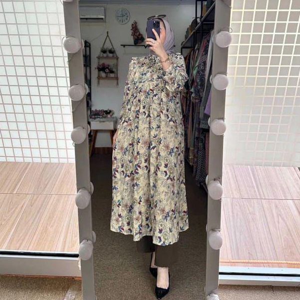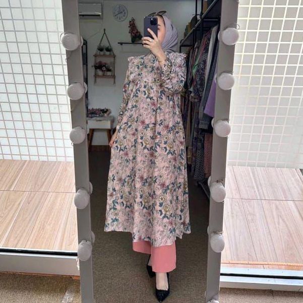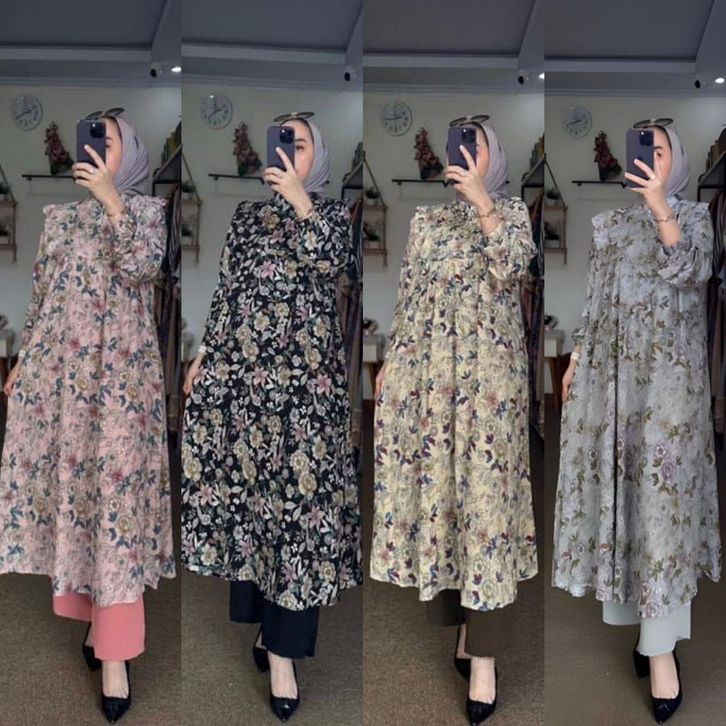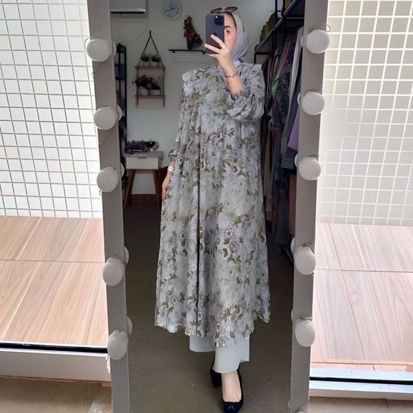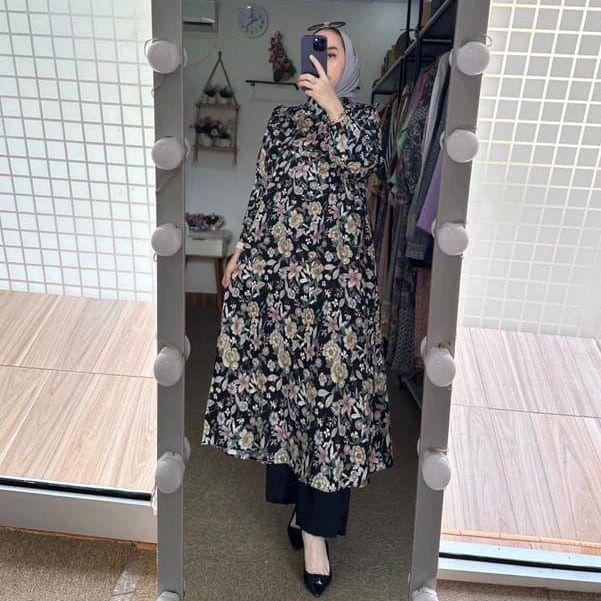 TERLARIS ONE SET AURELIA TUNIK RAYON-SETELAN LONG TUNIK RAYON MOTIF BUNGA NEW CELANA CRINKLE-ONE SET WANITA TERBARU