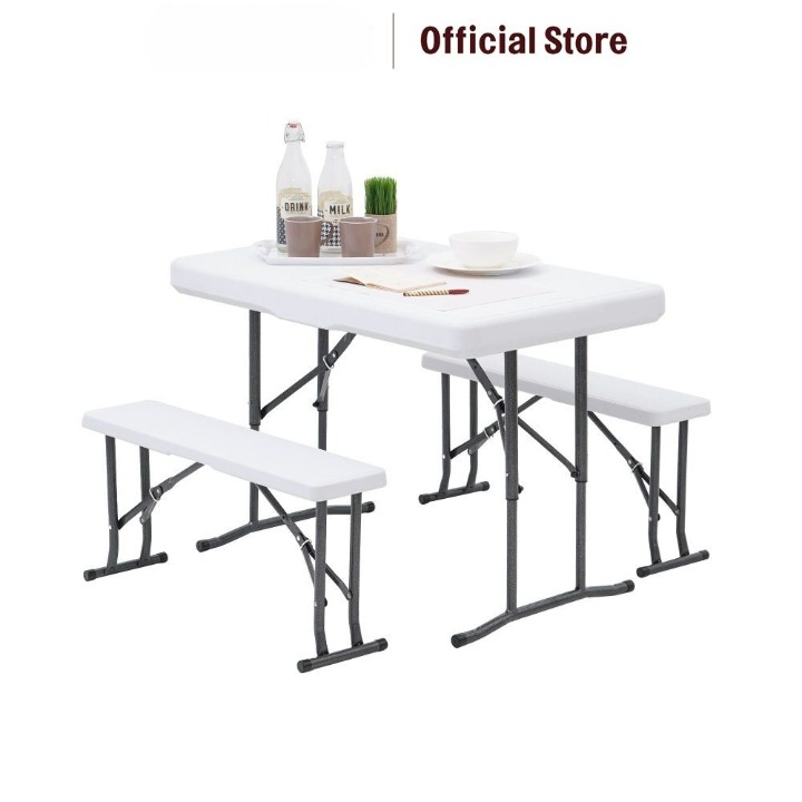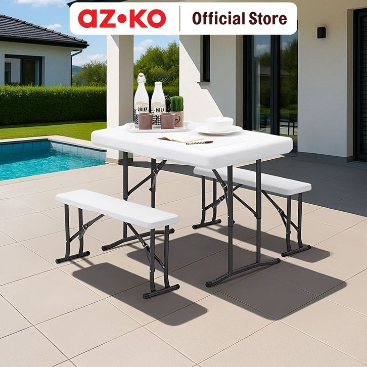 SET MEJA & BANGKU BENCH LIPAT - PUTIH KURSI DAN MEJA TAMAN FOLDABLE GARDEN DESK AND CHAIR PICNIC TABLE BENCHES SET