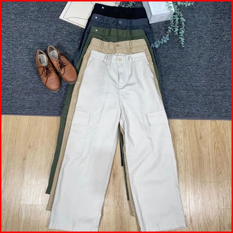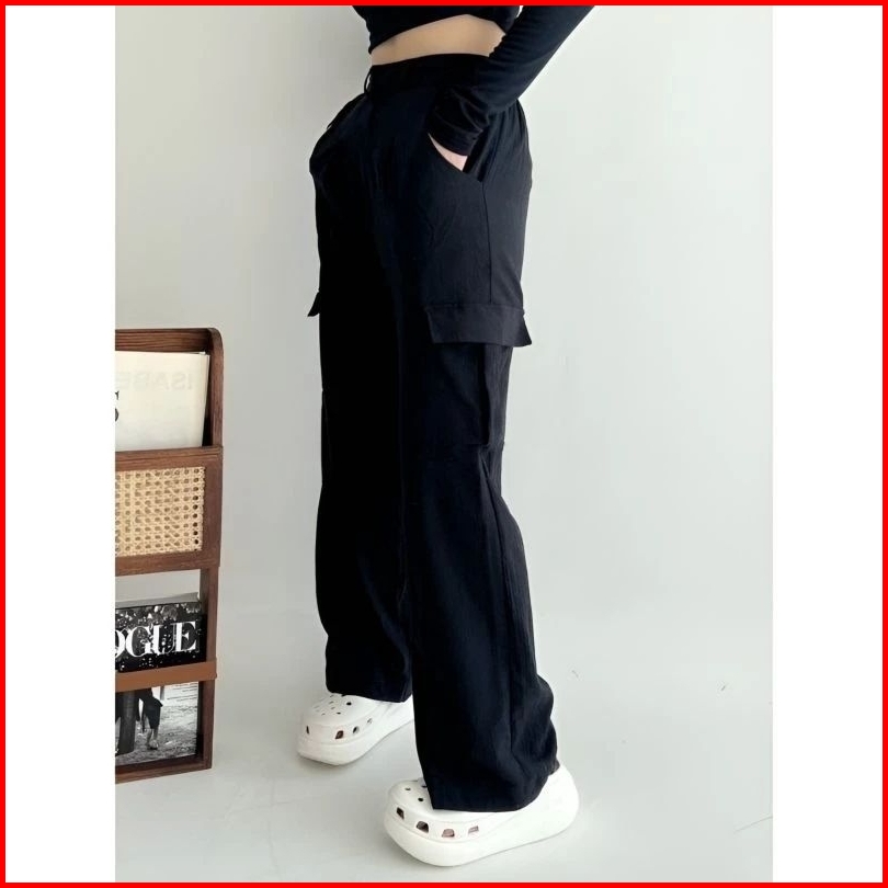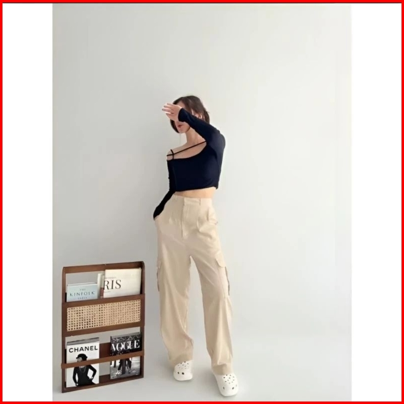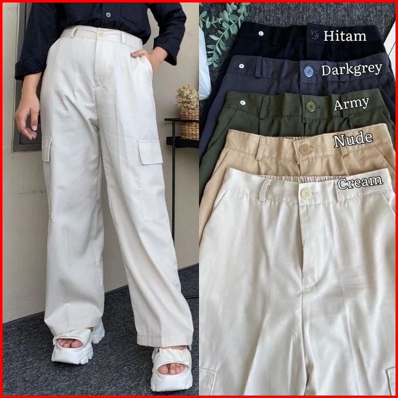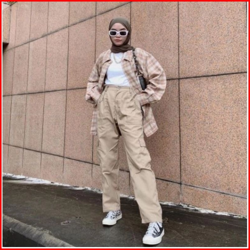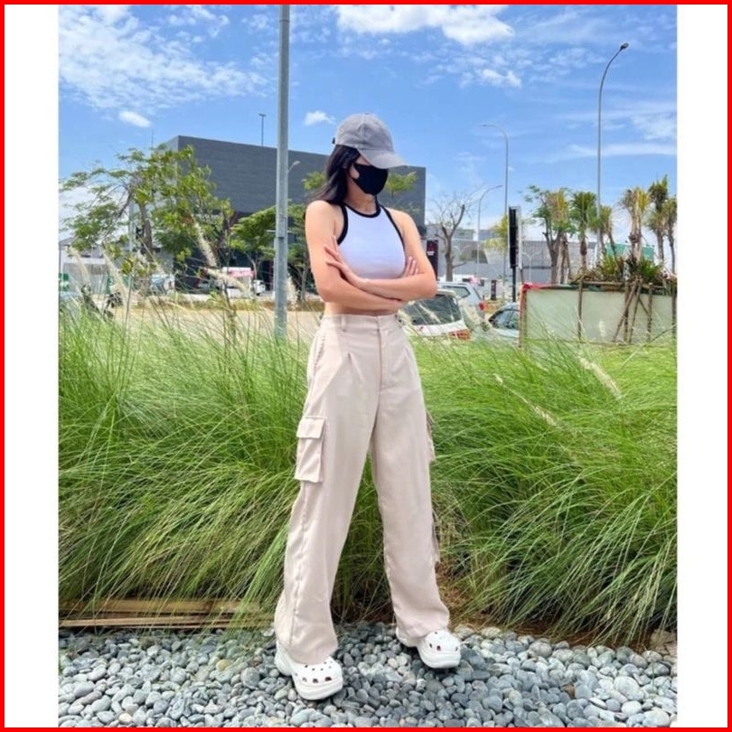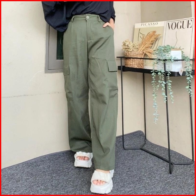 Celana Cargo Wanita Loose Pants Kekinian Cargo Pants Highwaist Drill