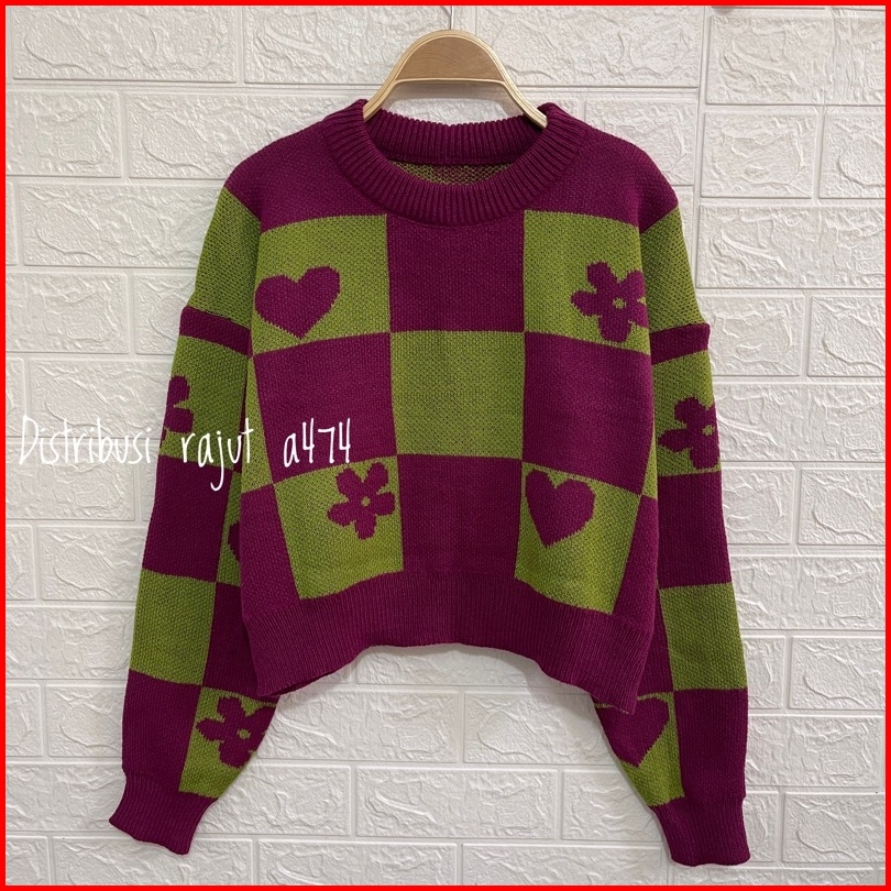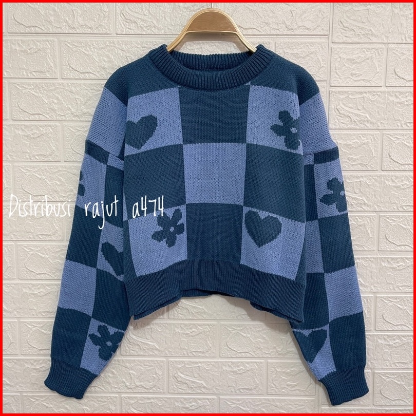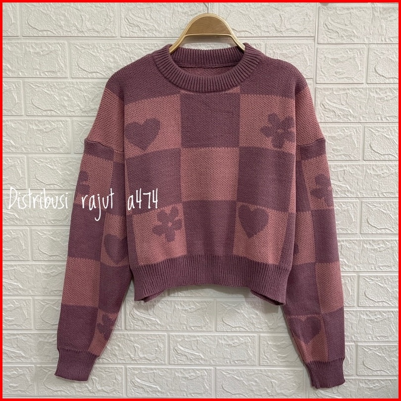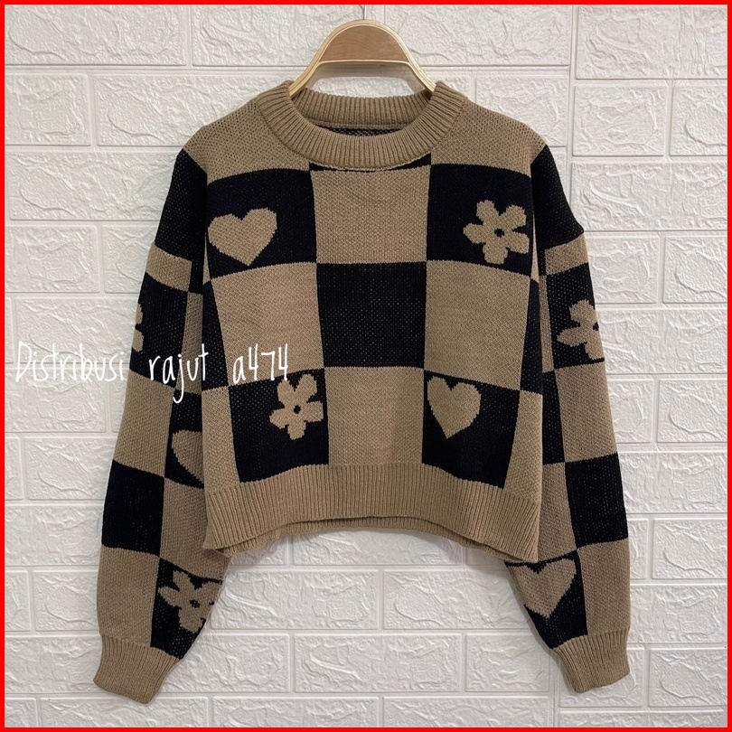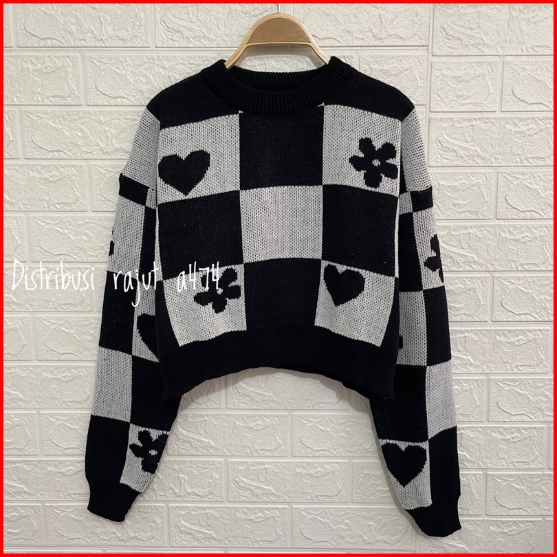 Elsa Sweater Rajut Crop Motif Love Bunga Kotak Kotak Lengan Panjang