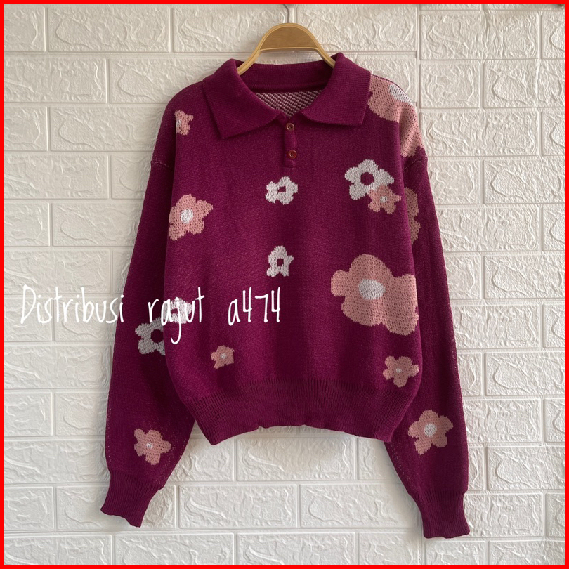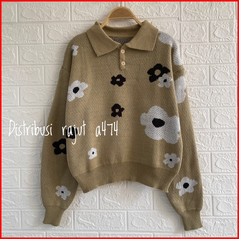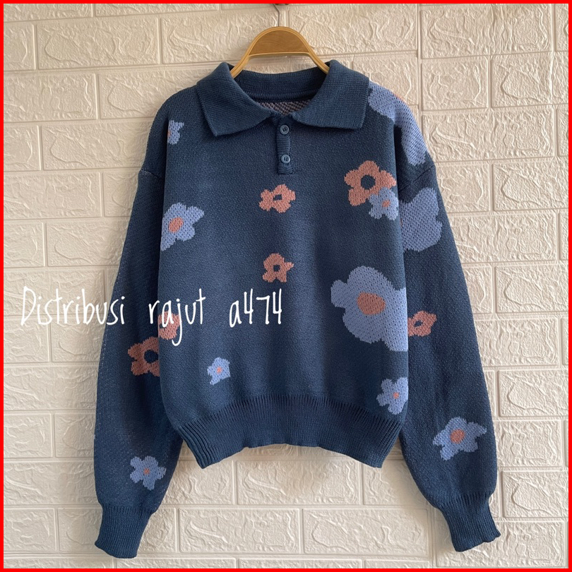 Tangsi Polo Sweater Rajut Korea Motif Bunga Atasan Lengan Panjang Wanita