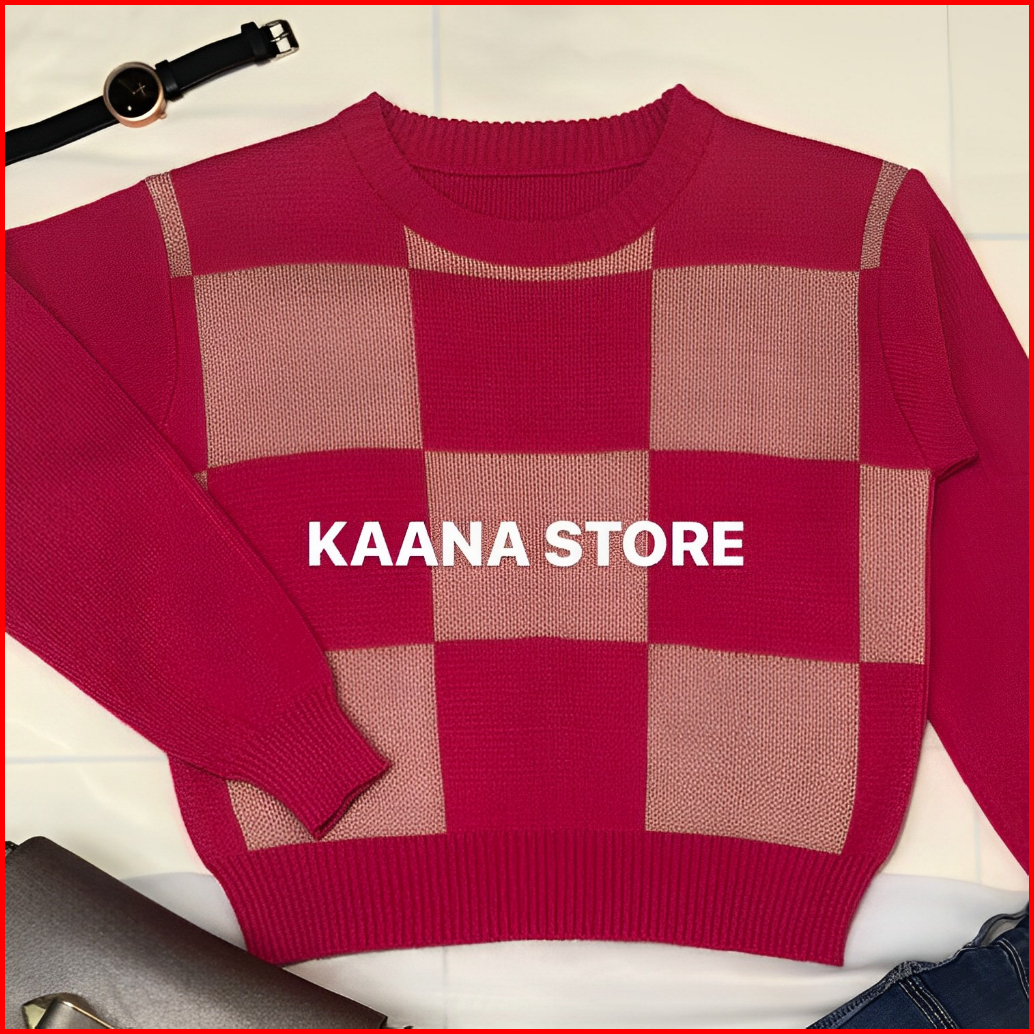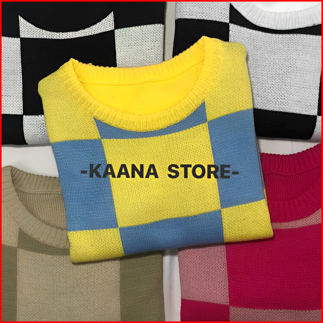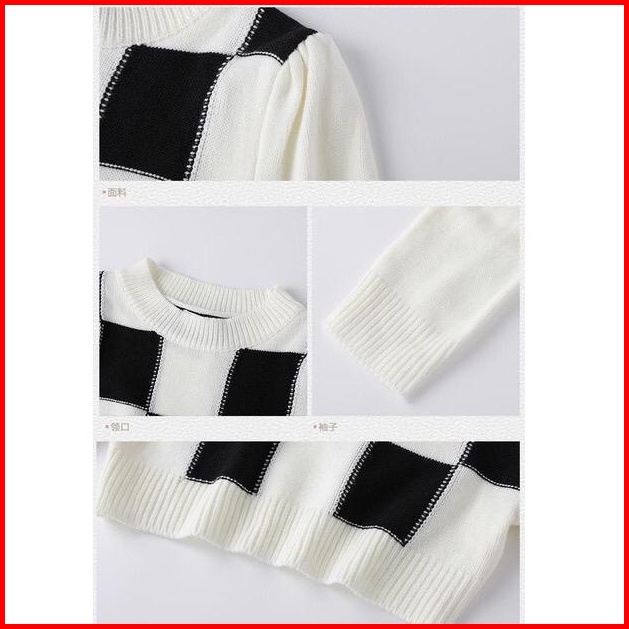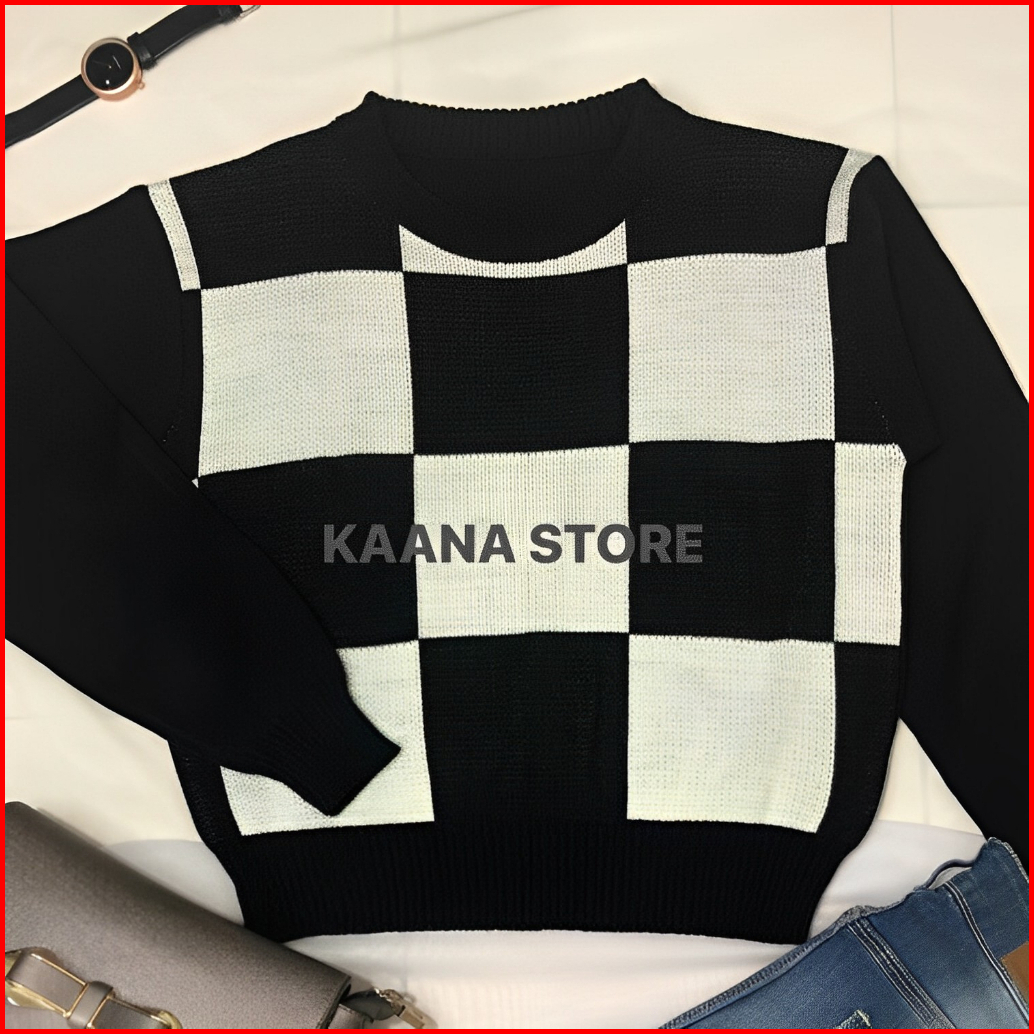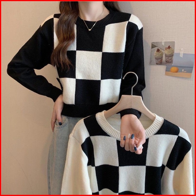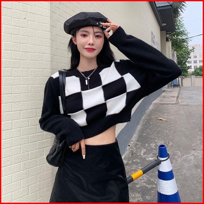 Crop Top Rajut Lengan Panjang Wanita Korea Sweater Atasan-yikoo Kotak Kotak Sweater Rajut Crop Top Lengan Panjang Wanita