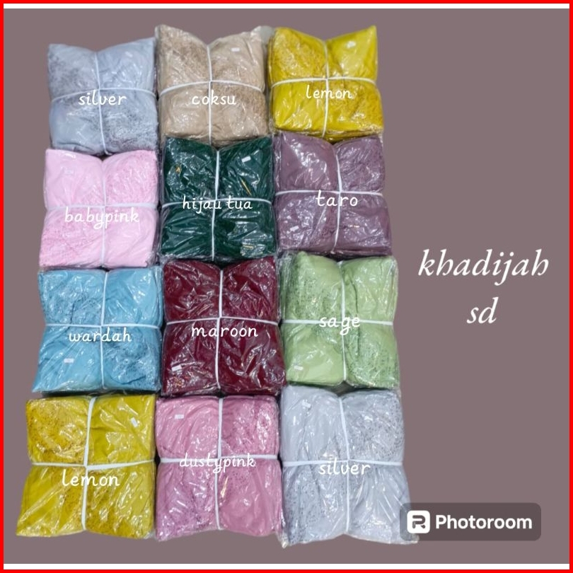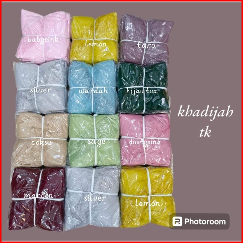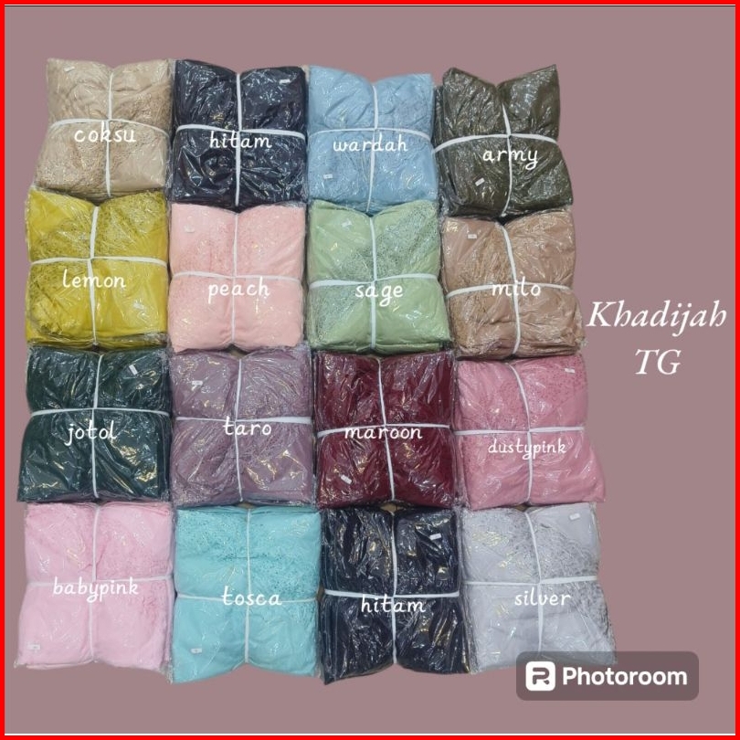 Dusty pink, Army, Putih, Peach, Hijau botol, Mocca, Coksu, Maroon, Sage/hijau, Dongker, Taro, Hitam, Caramel, Baby pink, Lilac, Lemon, Wardah/tosca, Abu, Baby blue, Coklat tua, Abu tua, Kuning kunyit