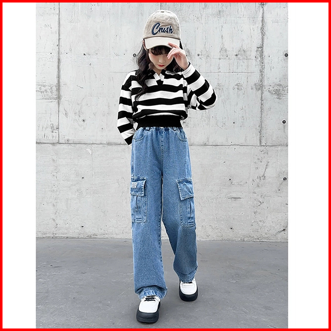 Celana Panjang Jeans Cargo Anak Perempuan - Bawahan Kulot Kargo Anak Remaja Jeans 6-13 Tahun