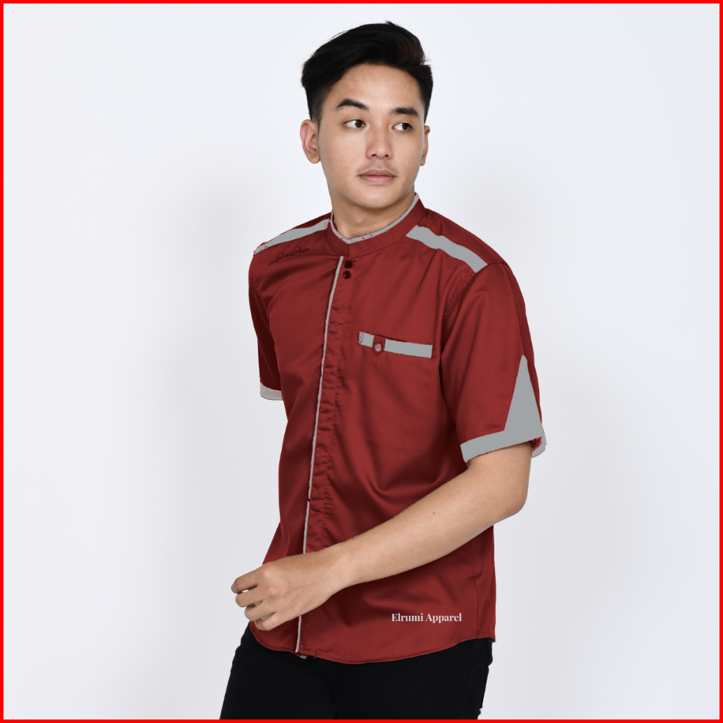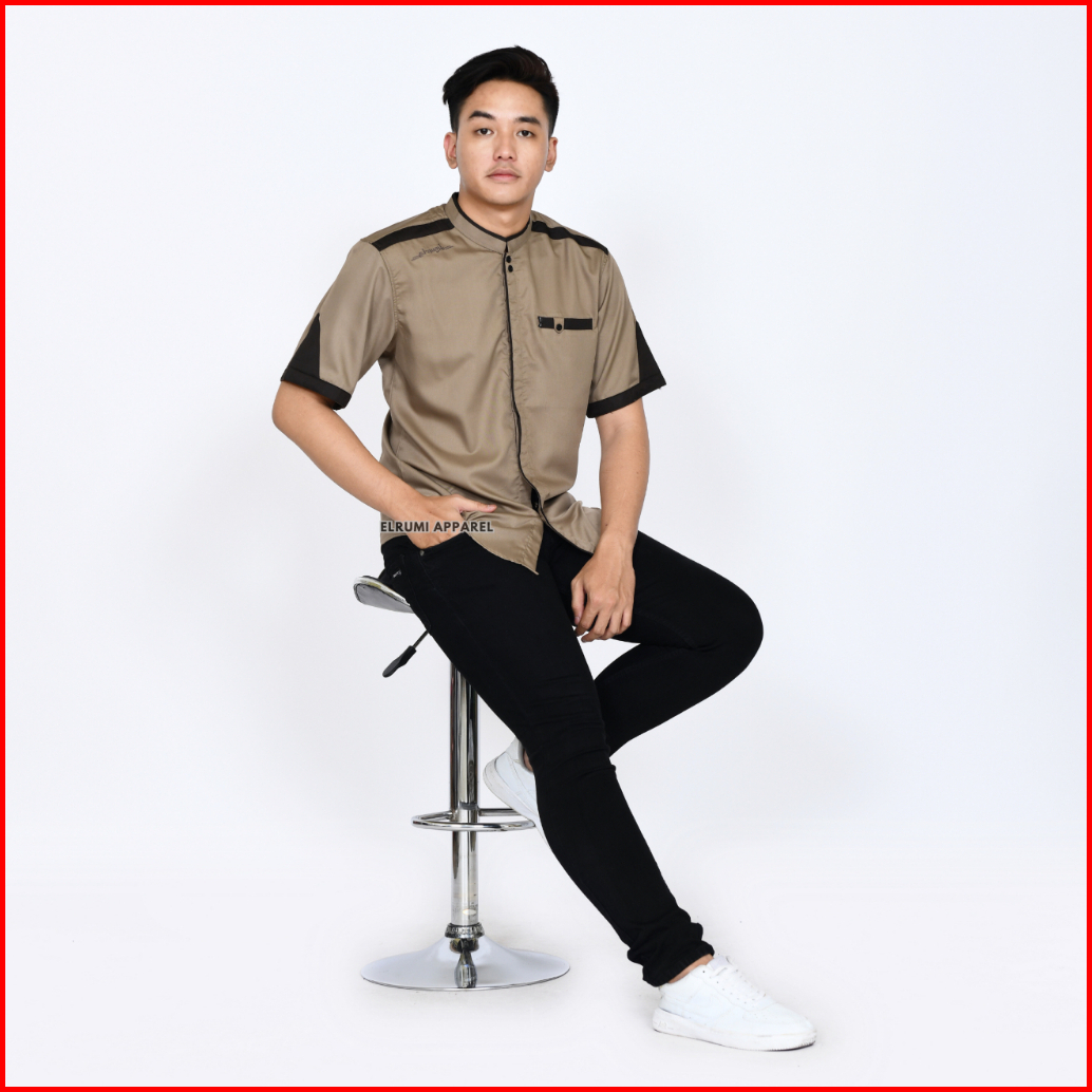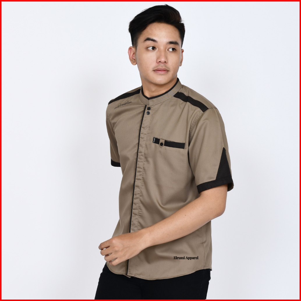 Baju Koko Pria Dewasa Lengan Pendek Elrumi Muslim Kombinasi Bordir Warna Coklat Motif Yisunsin