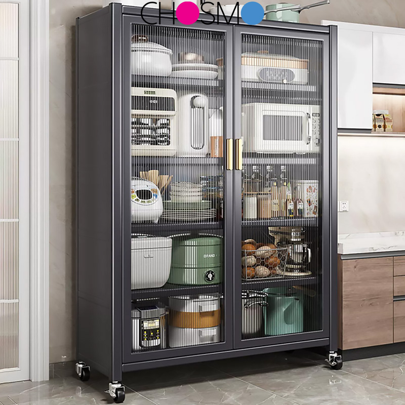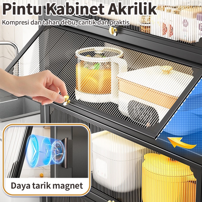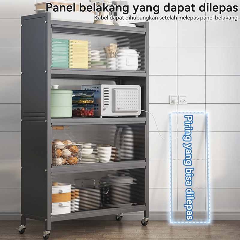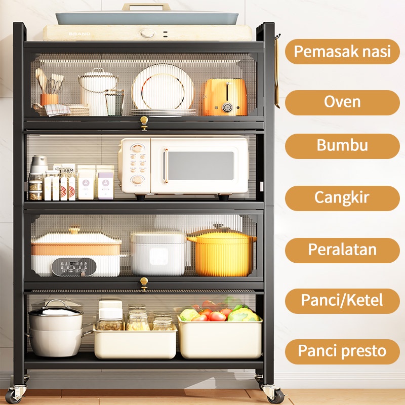 RAK DAPUR LEMARI DAPUR RAK OVEN MICROWAVE RAK PENYIMPANAN MULTI-LAYER DENGAN RODA PINTU POT RACK