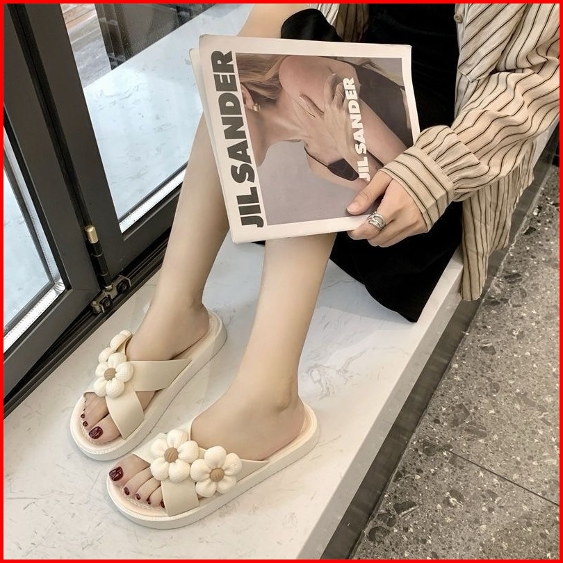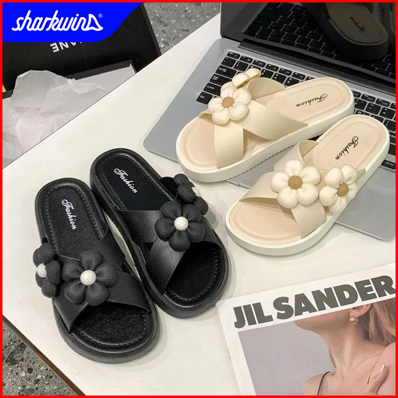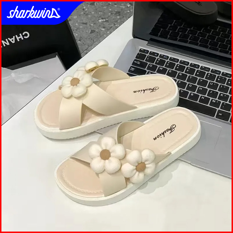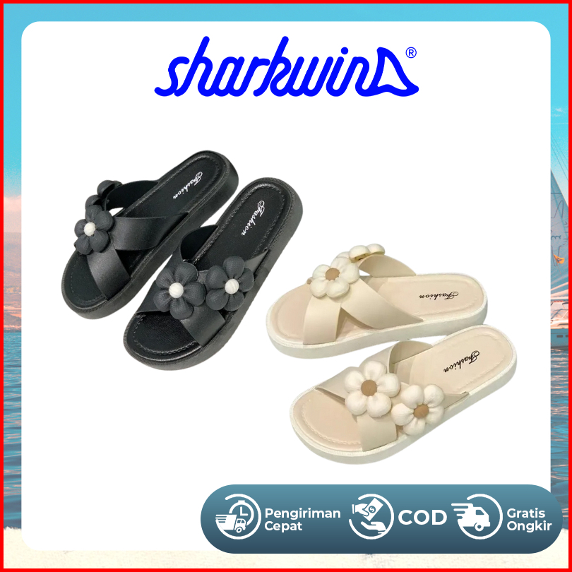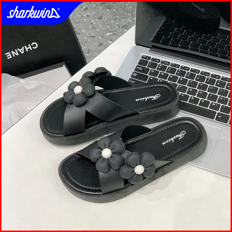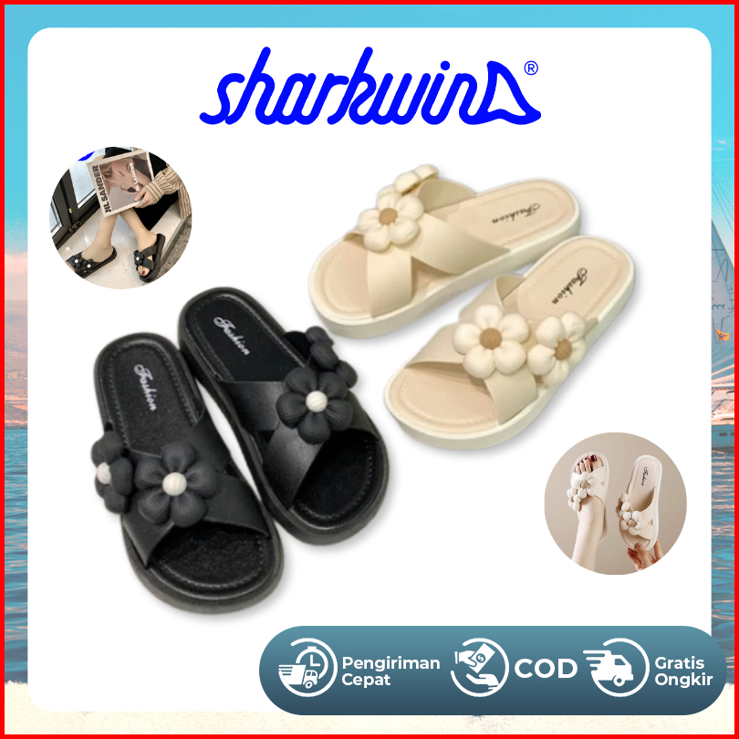Sharkwin Sendal Wanita Slop Bunga Pvc Flower Sandal Jalan Santai Nyaman Korea Slip On Sf30702