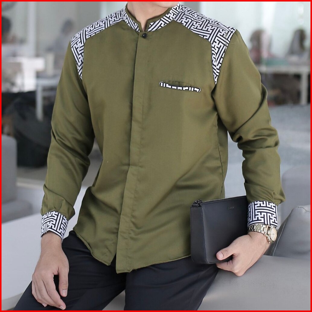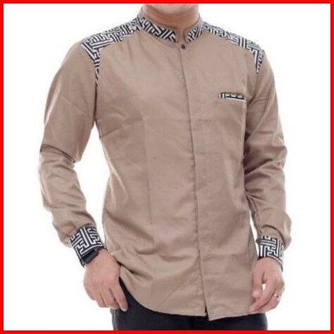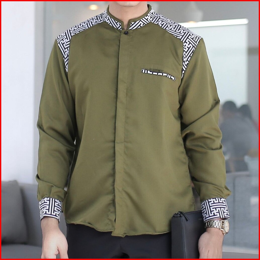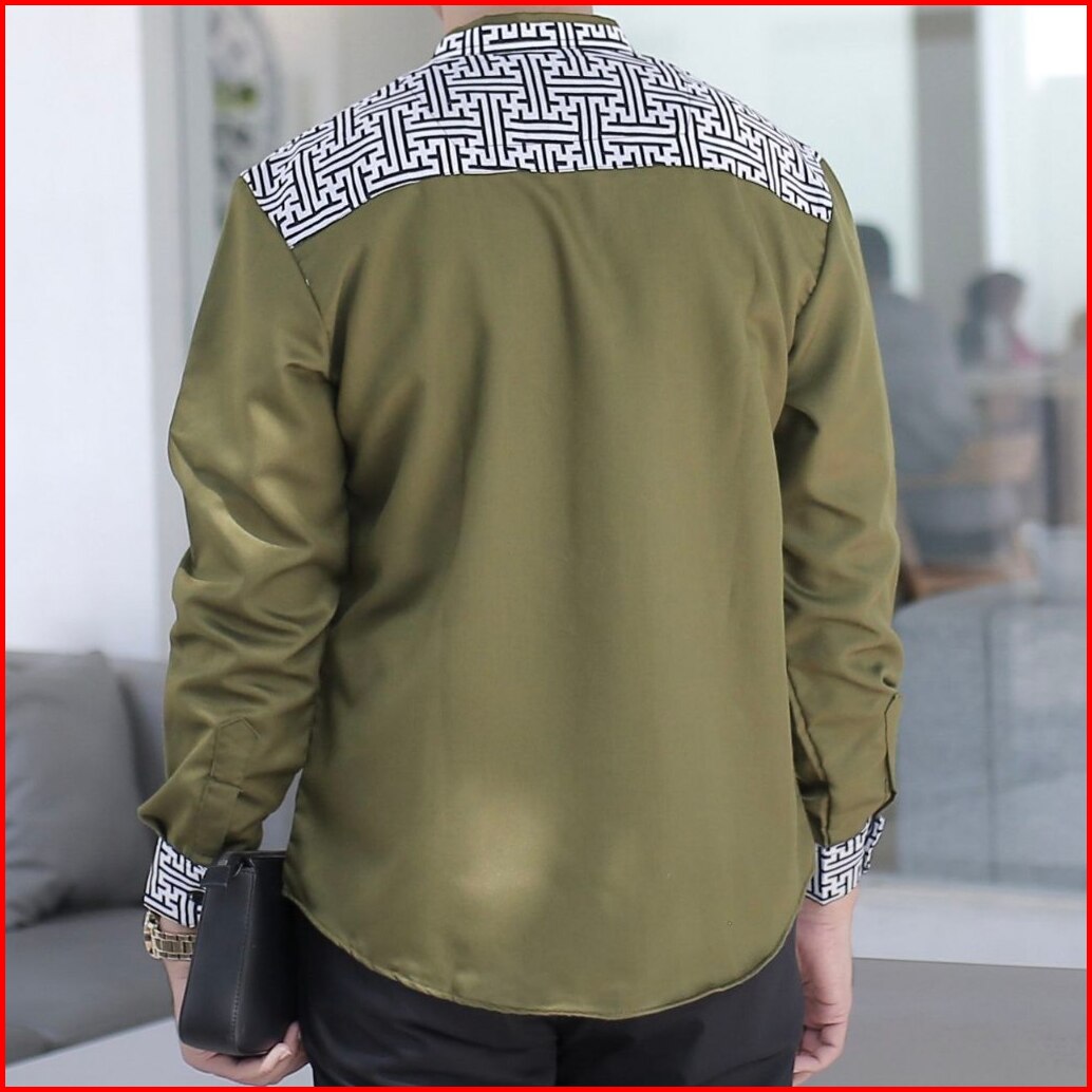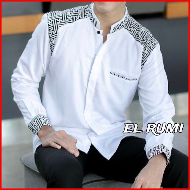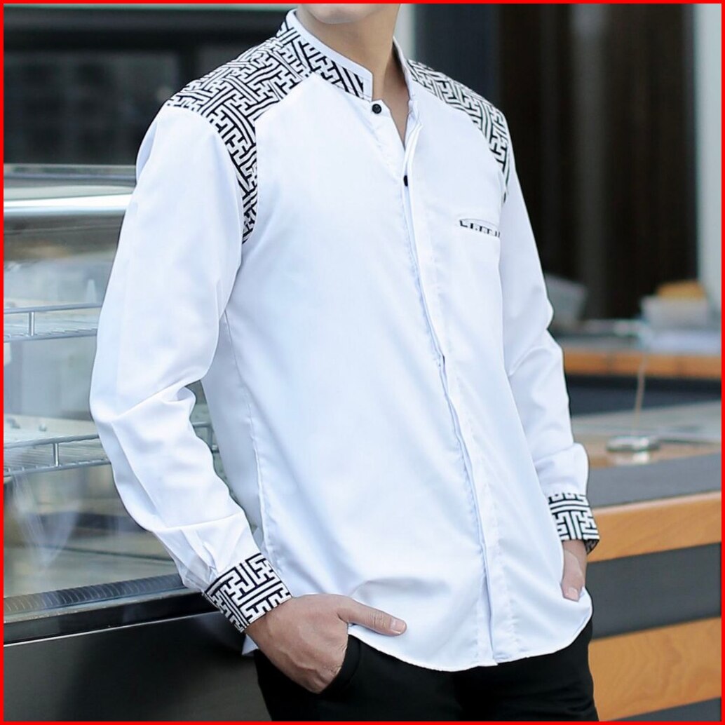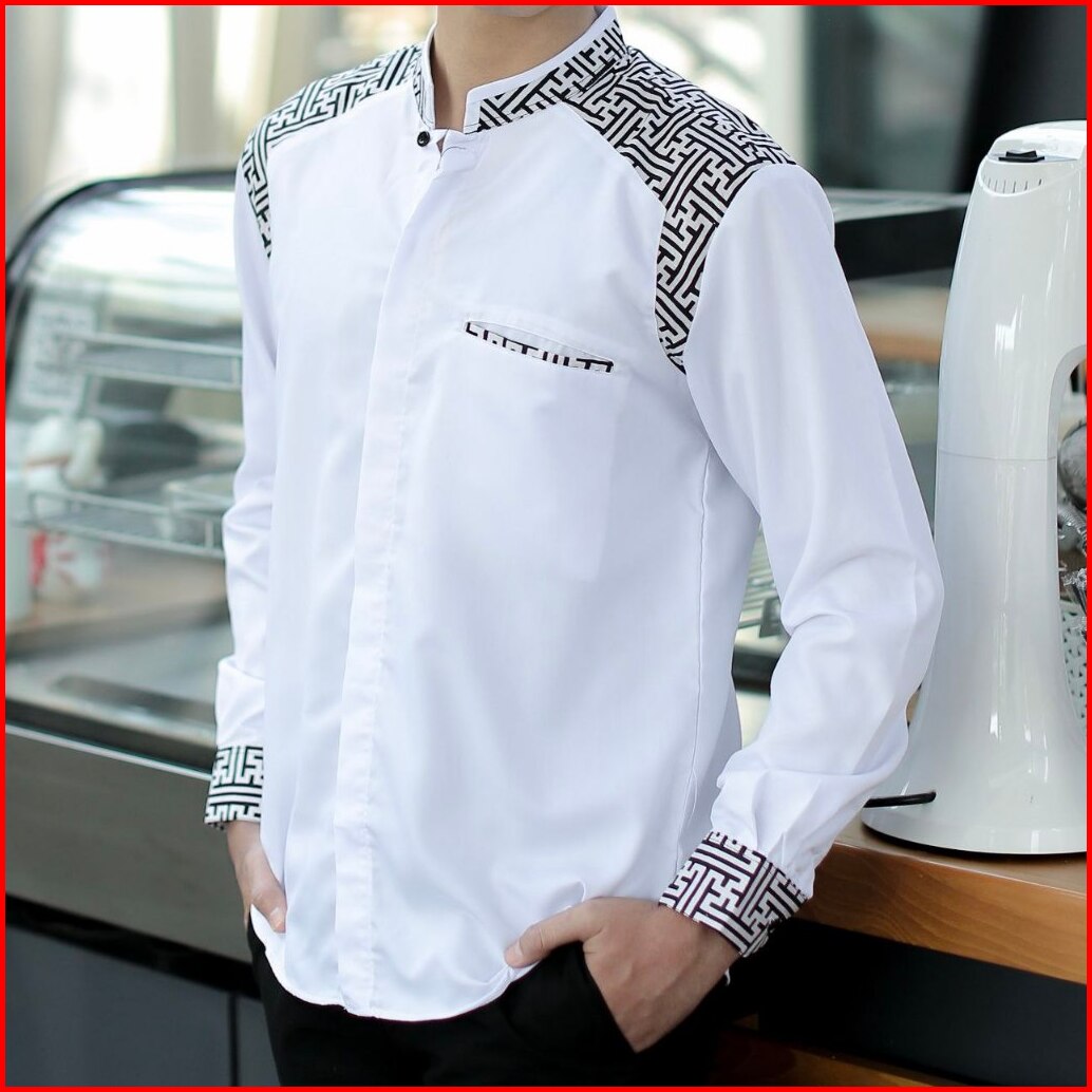 Kemeja Koko Pria Lengan Panjang Elrumi Motif Araseo Kombinasi Batik Warna Putih Bahan Katun Toyobo