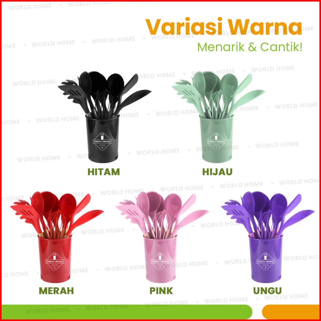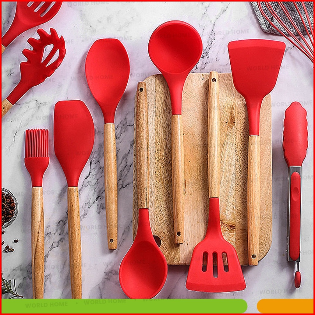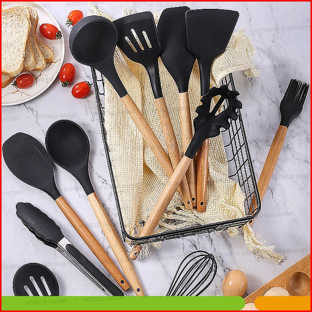 World Home Spatula Silicone Set 12pcs Tahan Panas Kitchen Utensil Bucket Set Spatula Silikon Non-stick Gagang Kayu