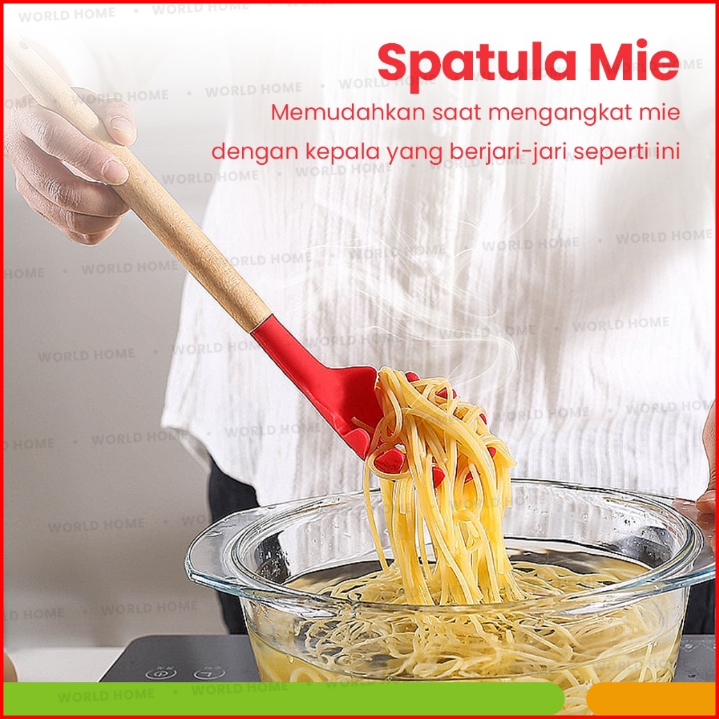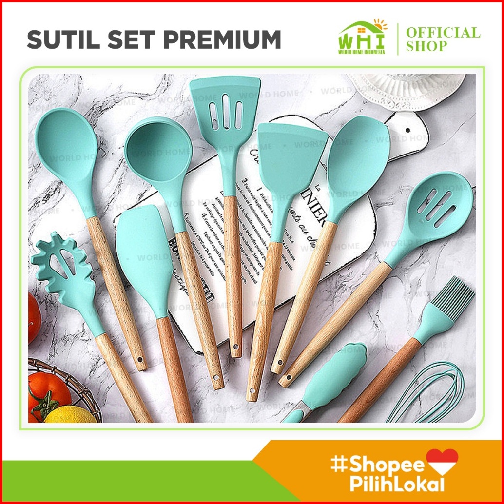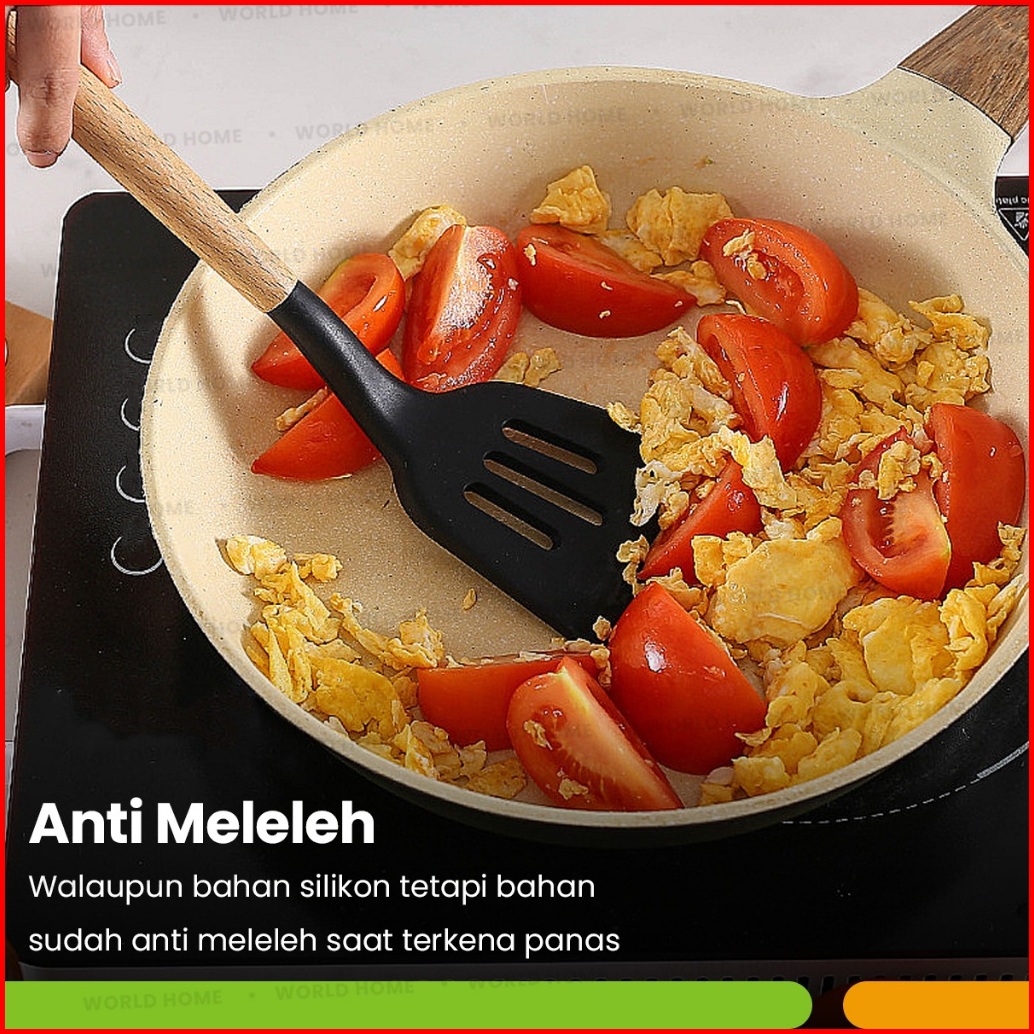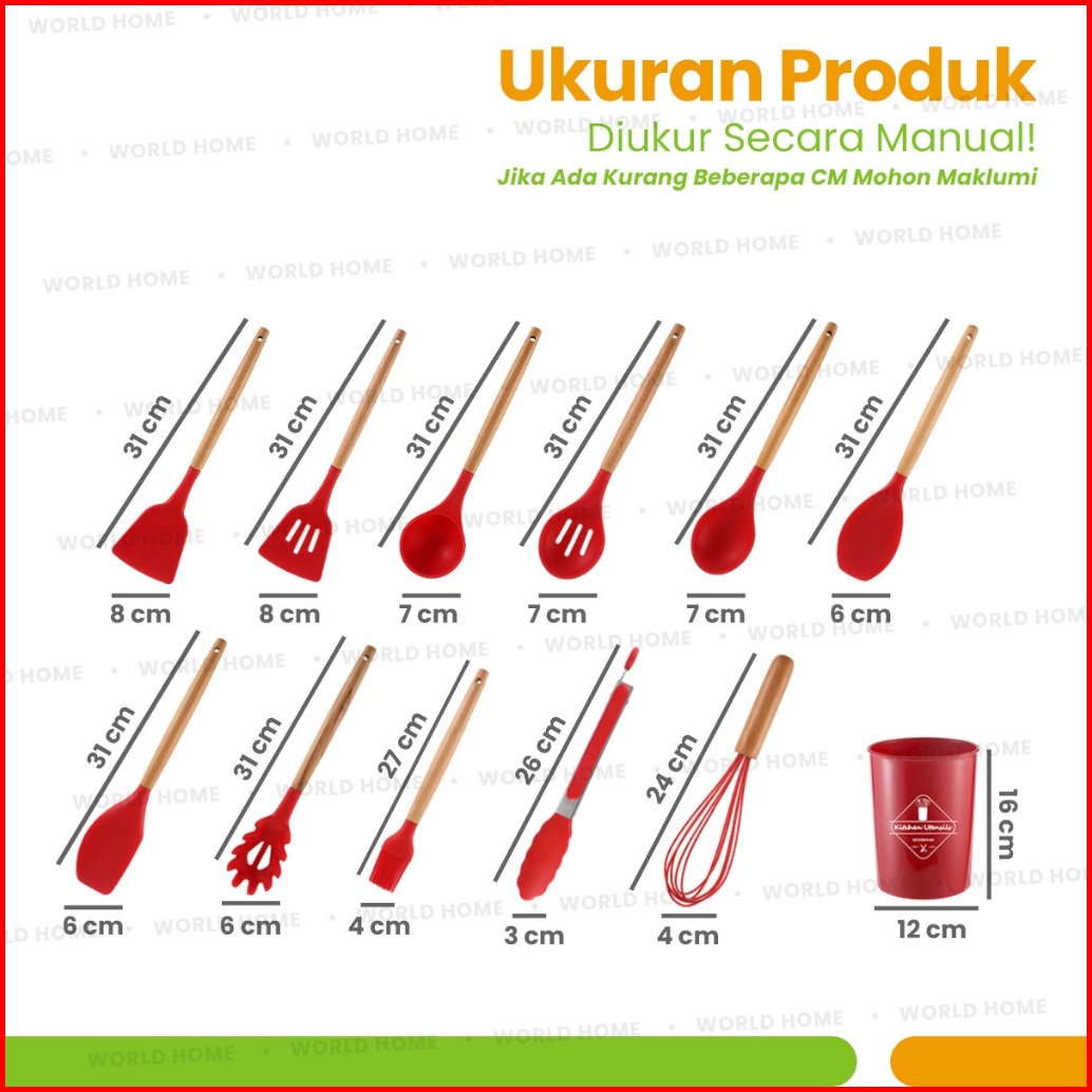 World Home Spatula Silicone Set 12pcs Tahan Panas Kitchen Utensil Bucket Set Spatula Silikon Non-stick Gagang Kayu