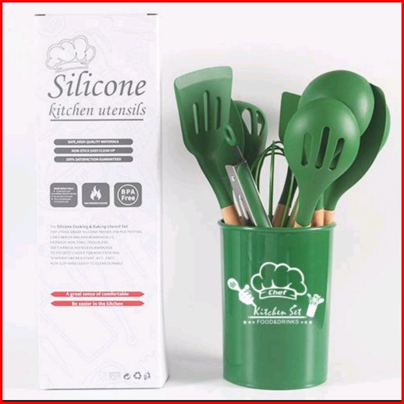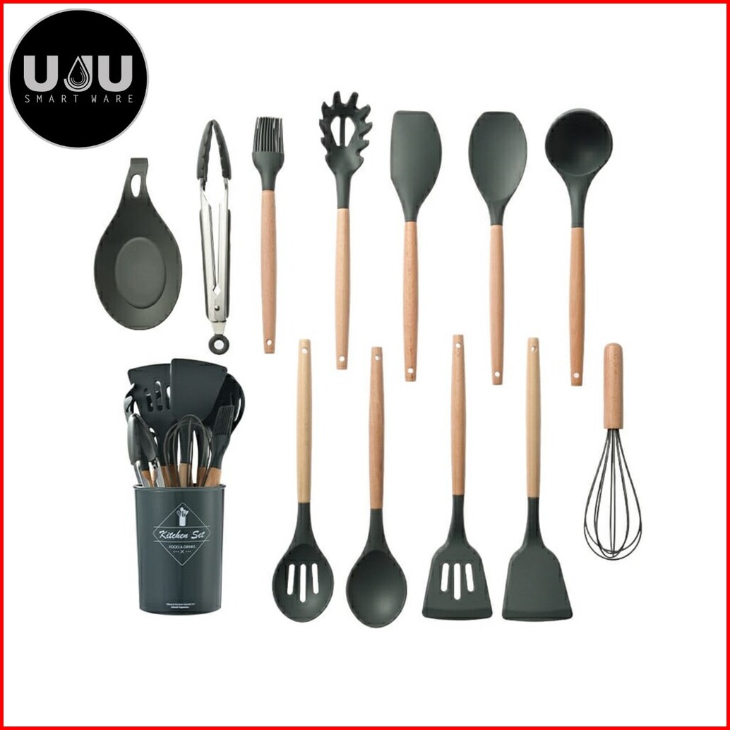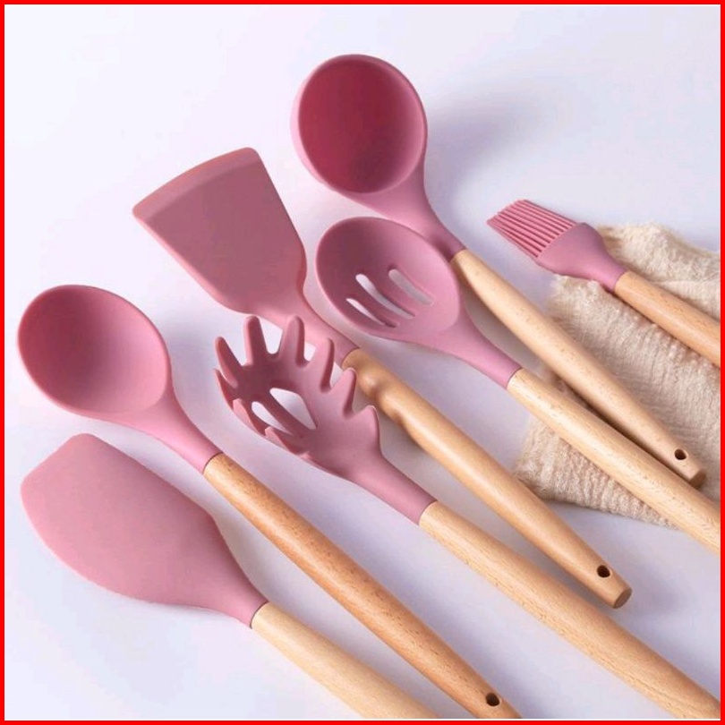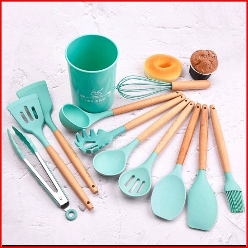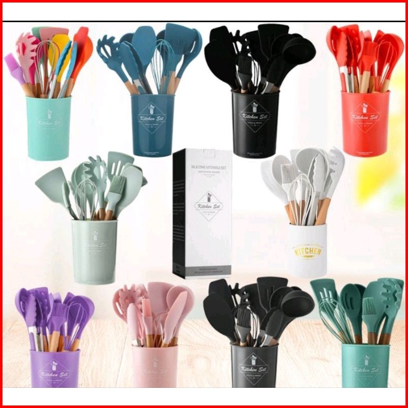 Sillicone Utensil Set 12pcs Spatula Peralatan Masak Sutil Pegangan Kayu Baking Set Wadah