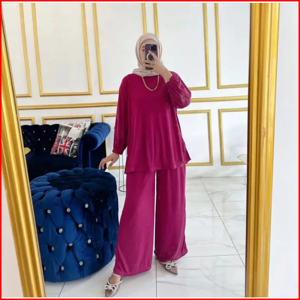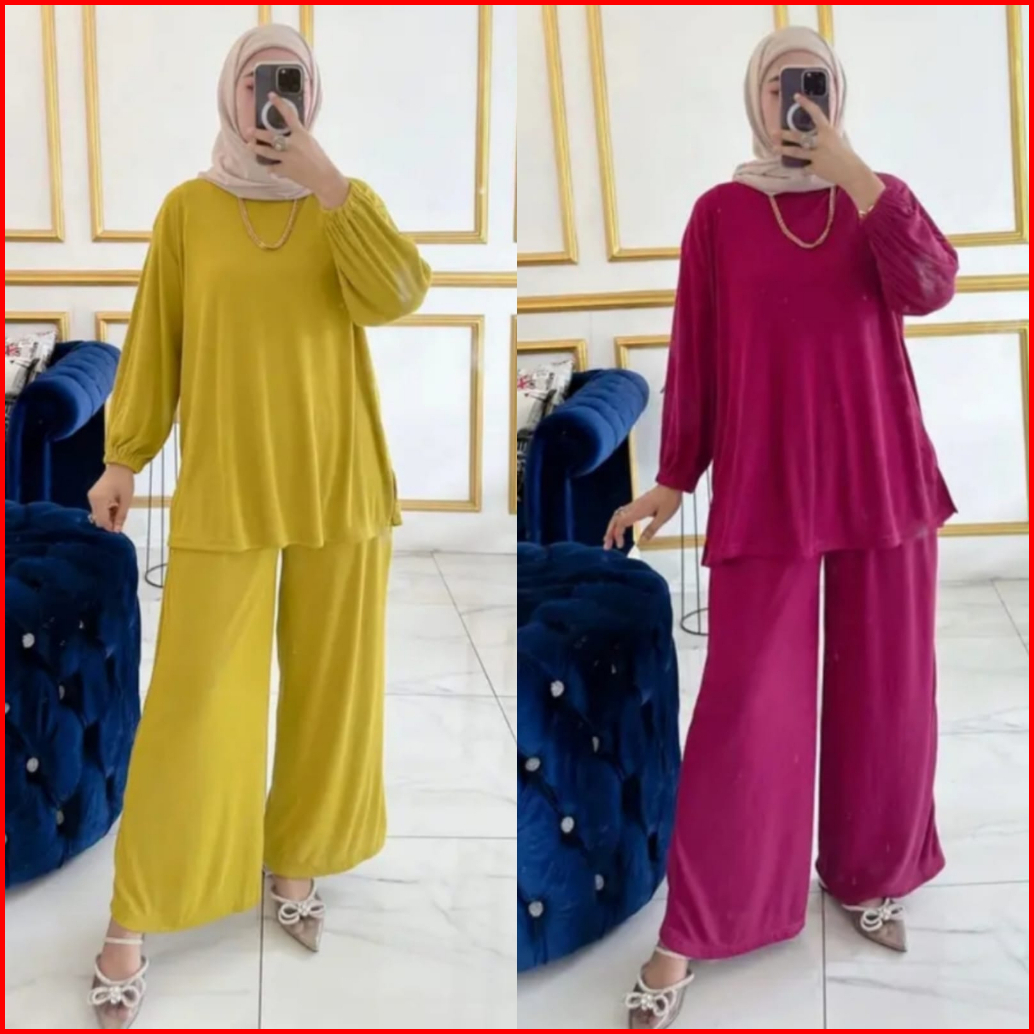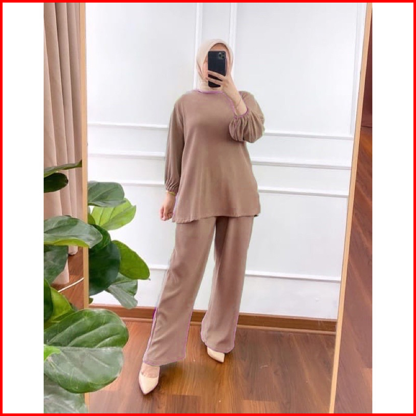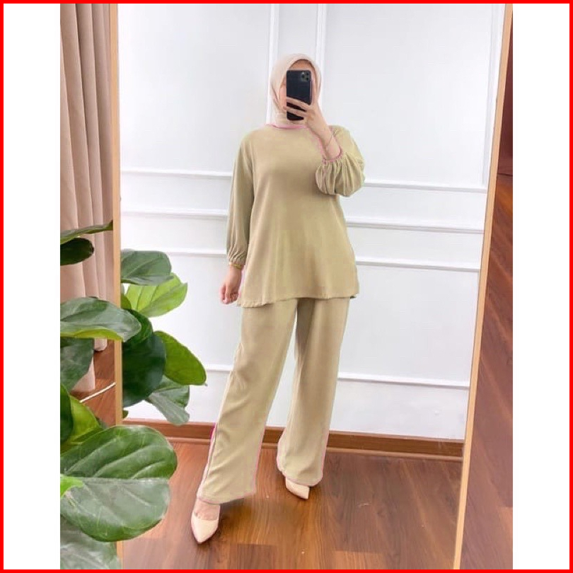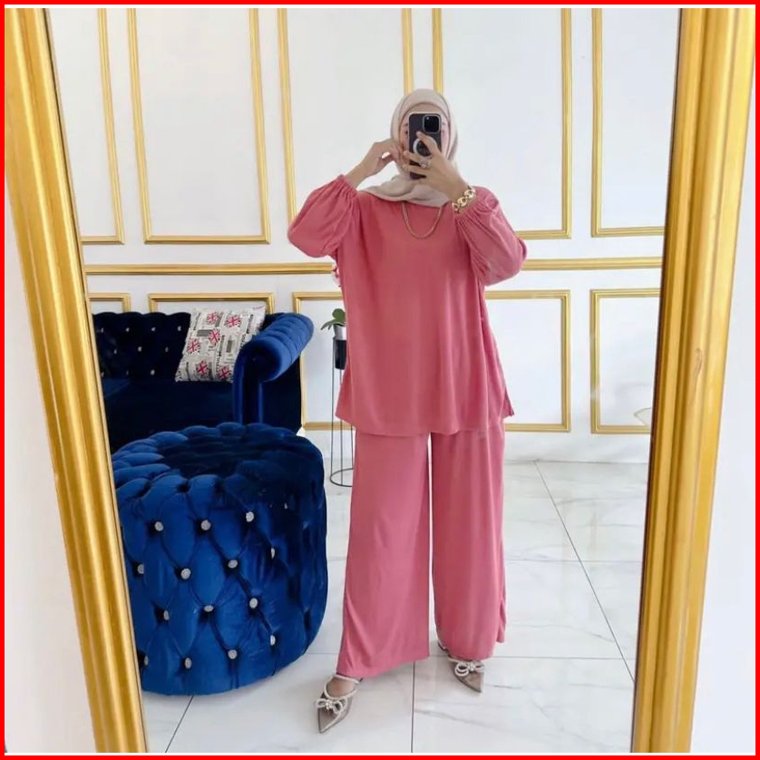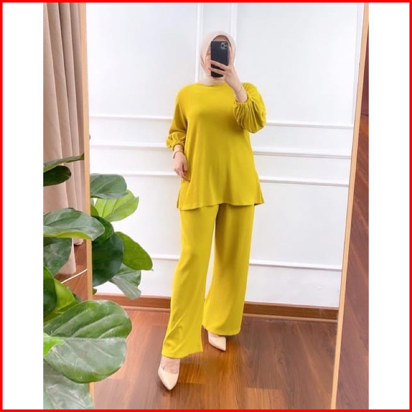 Jhena One Set - Setelan Celana Bahan Rib Knit Melar Model Simple Tangan Kerut Ghs