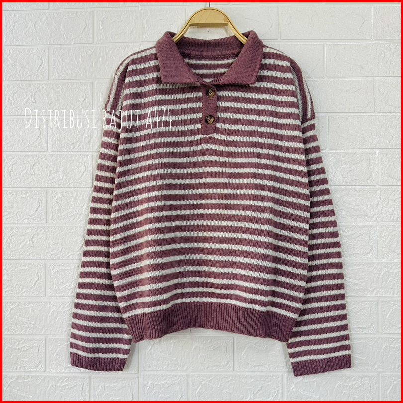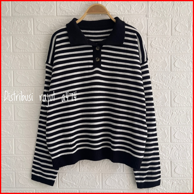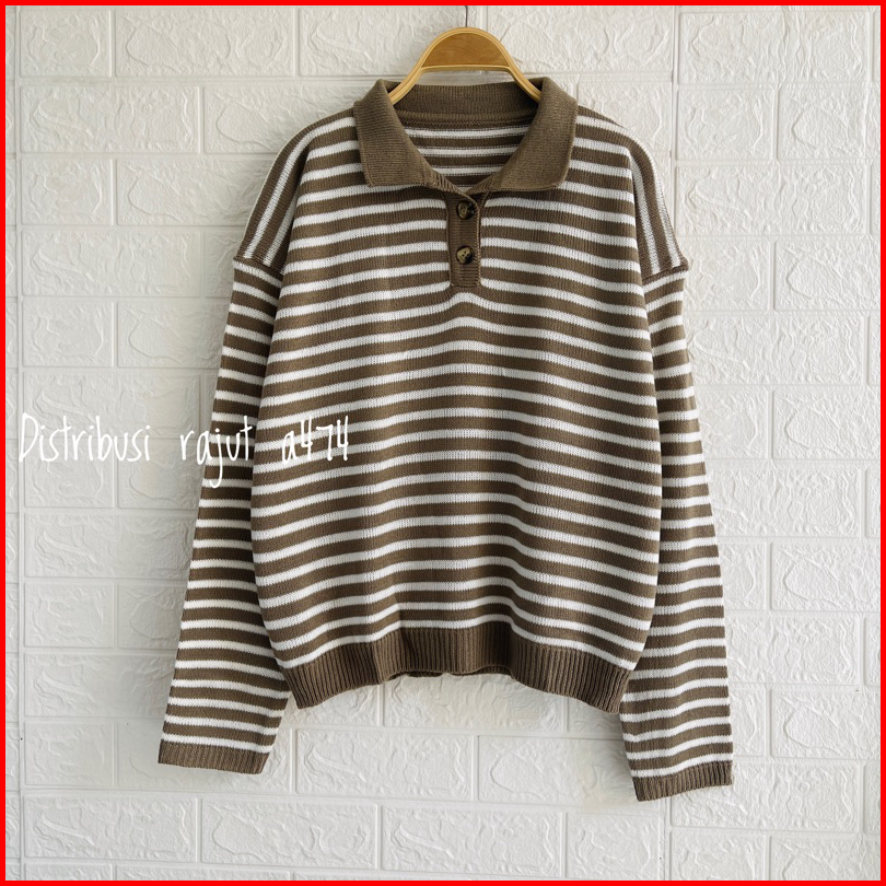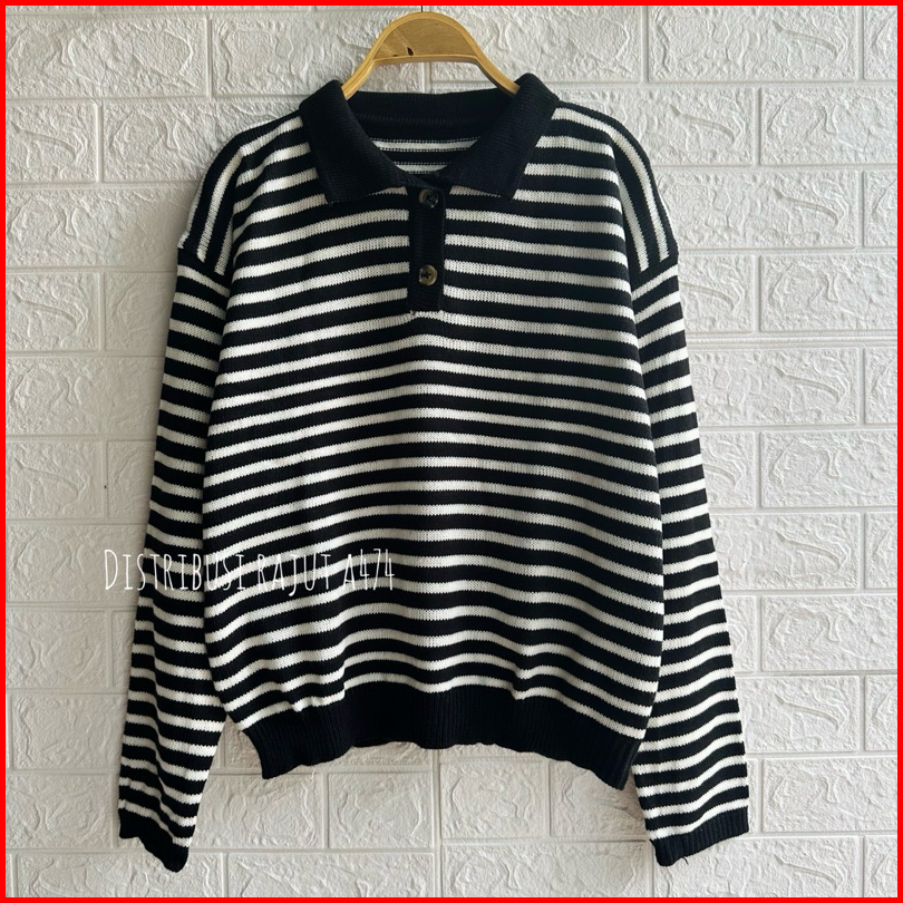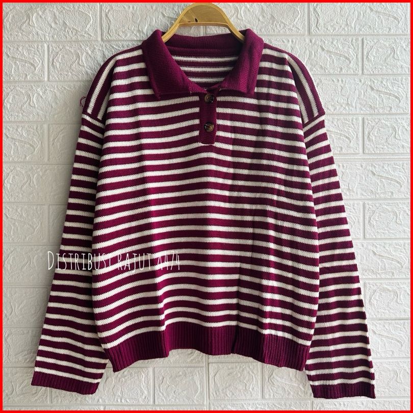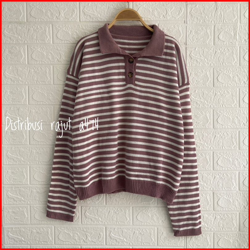 Javanese Polo Kancing Sweater Rajut Stippe Motif Blaster Oversize Atasan Lengan Panjang
