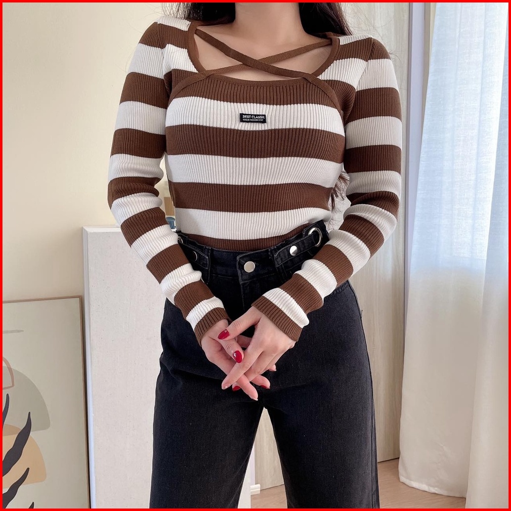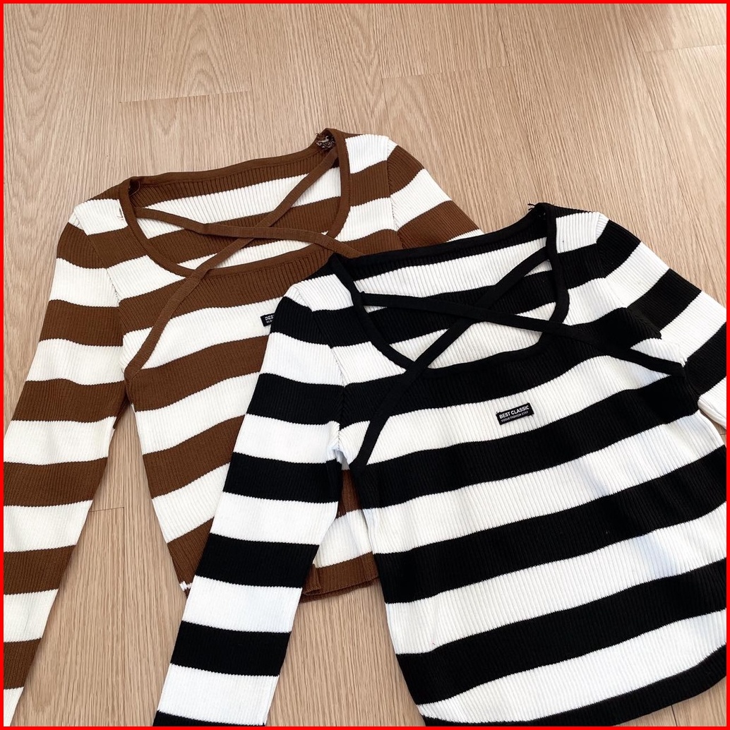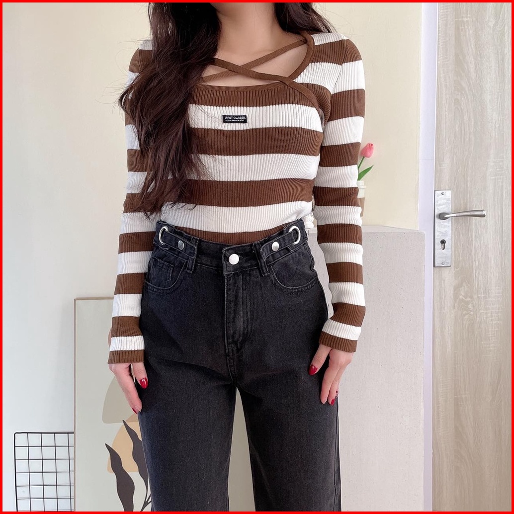 Modamyth Bt001 - Atasan Rajut Lengan Panjang Wanita Import Korean Style Top Rajut Stripes Knit