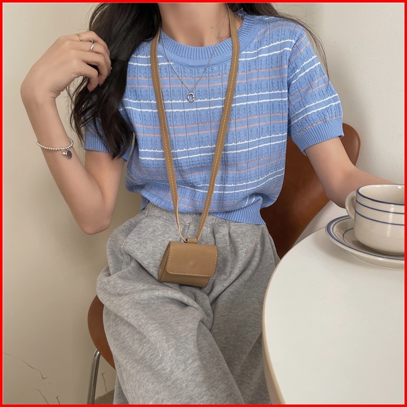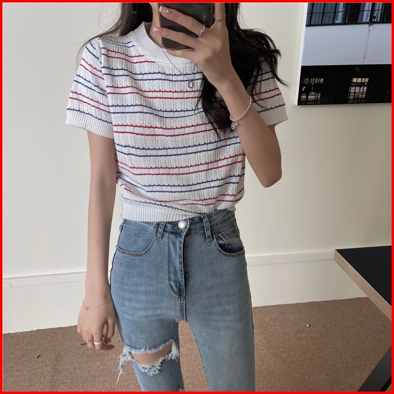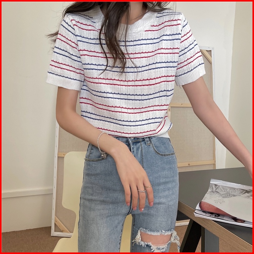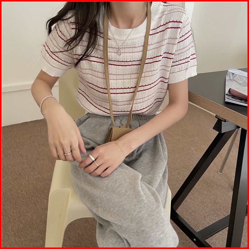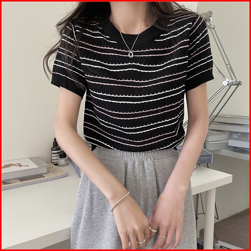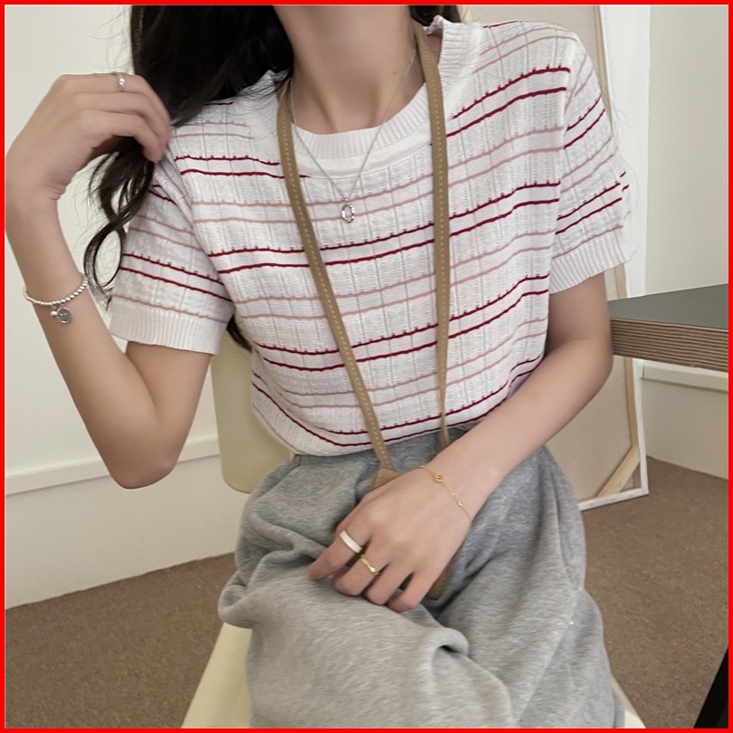 Kaos Rajut Lengan Pendek Wanita Striped T-shirt Knit Atasan Korean Style