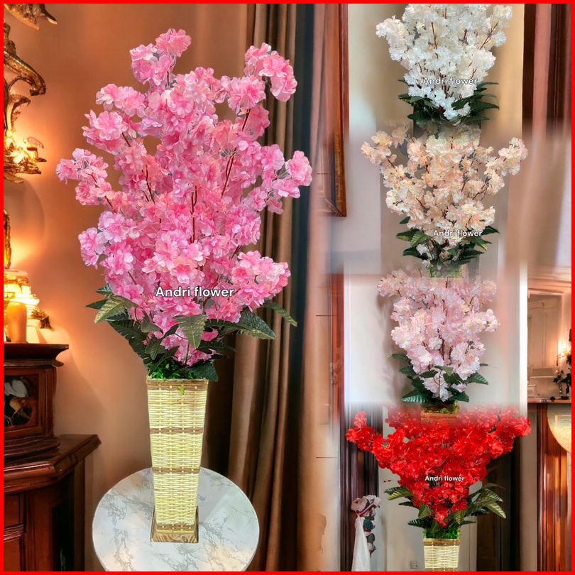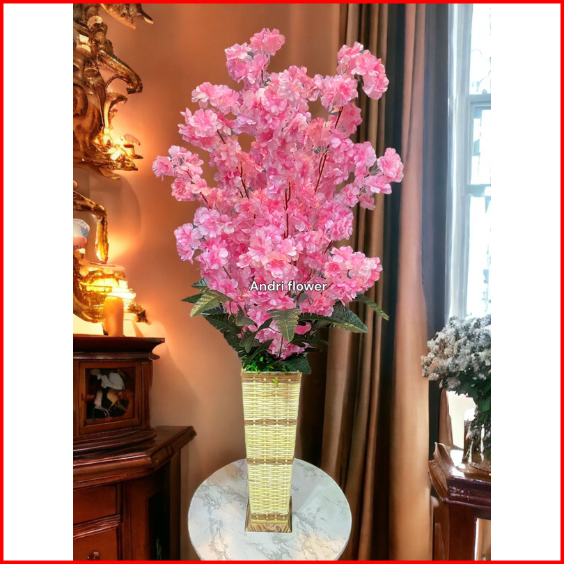Bunga Hias Sakura Belosom Cabang 12 Dengan Pot Rotan 40 Cm