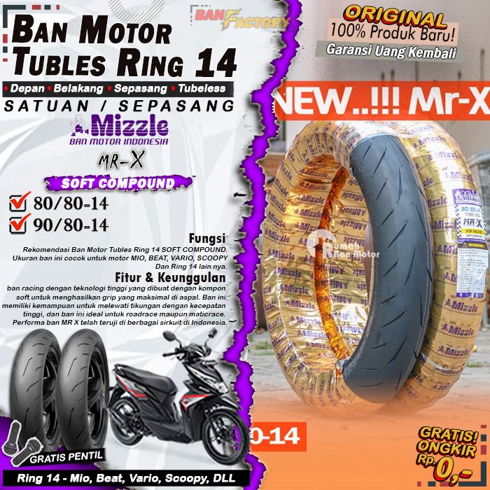 Sepasang Ban Motor Tubles Beat MIZZLE MR-X Ring 14 Ban Motor Tubeless Depan Belakang Beat Vario Scoopy Ring 14