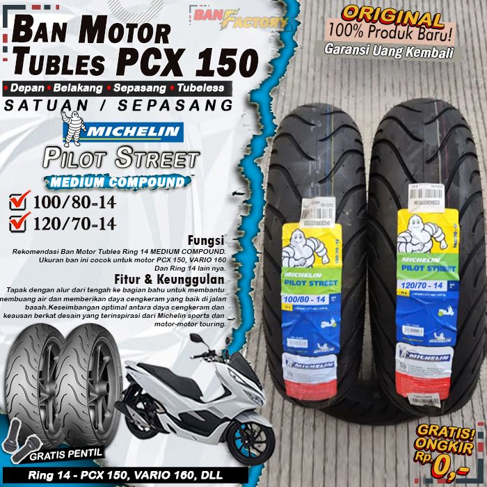 Sepasang Ban Motor Tubles PCX 150 VARIO 160 Michelin Pilot Street Ring 14 Ban Motor Tubeless Depan Belakang PCX Ring 14