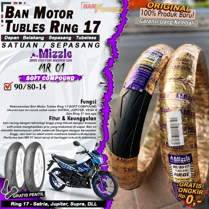 Sepasang Ban Motor Tubles MIZZLE MR-01 Ring 17 Ban Motor Tubeless Depan Belakang Satria Jupiter Supra Ring 17