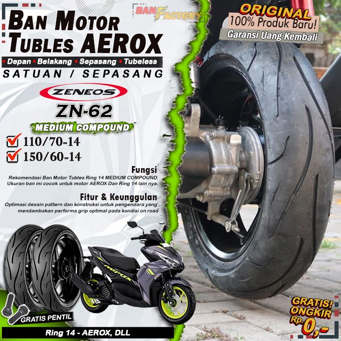 Sepasang Ban Motor Tubles AEROX ZENEOS ZN62 Ring 14 Ban Motor Tubeless Depan Belakang AEROX Ring 14