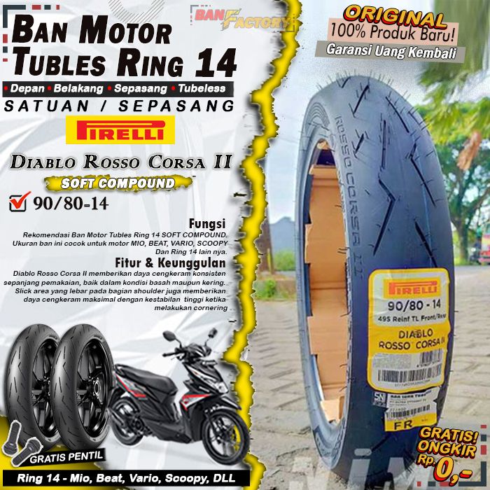 Sepasang Ban Motor Tubles Beat Pirelli Corsa 2 Ring 14 Ban Motor Tubeless Depan Belakang Beat Vario Scoopy Ring 14
