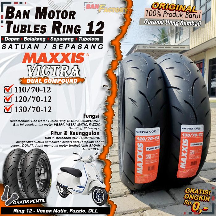 Sepasang Ban Motor Tubles Vespa MAXXIS VICTRA Ring 12 Ban Motor Depan Belakang Tubeless Vespa Fazzio Ring 12