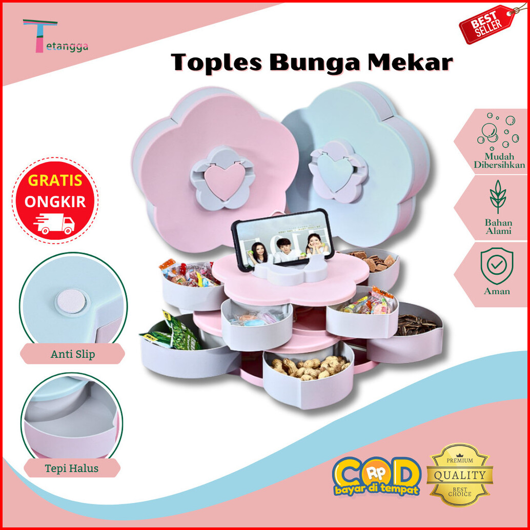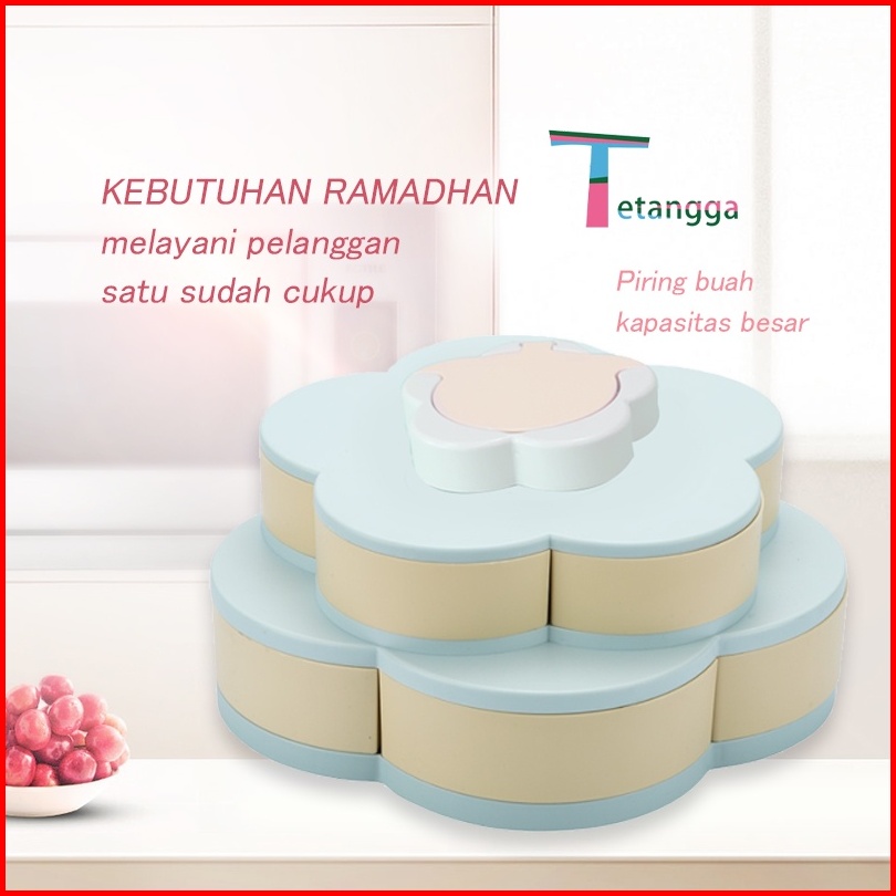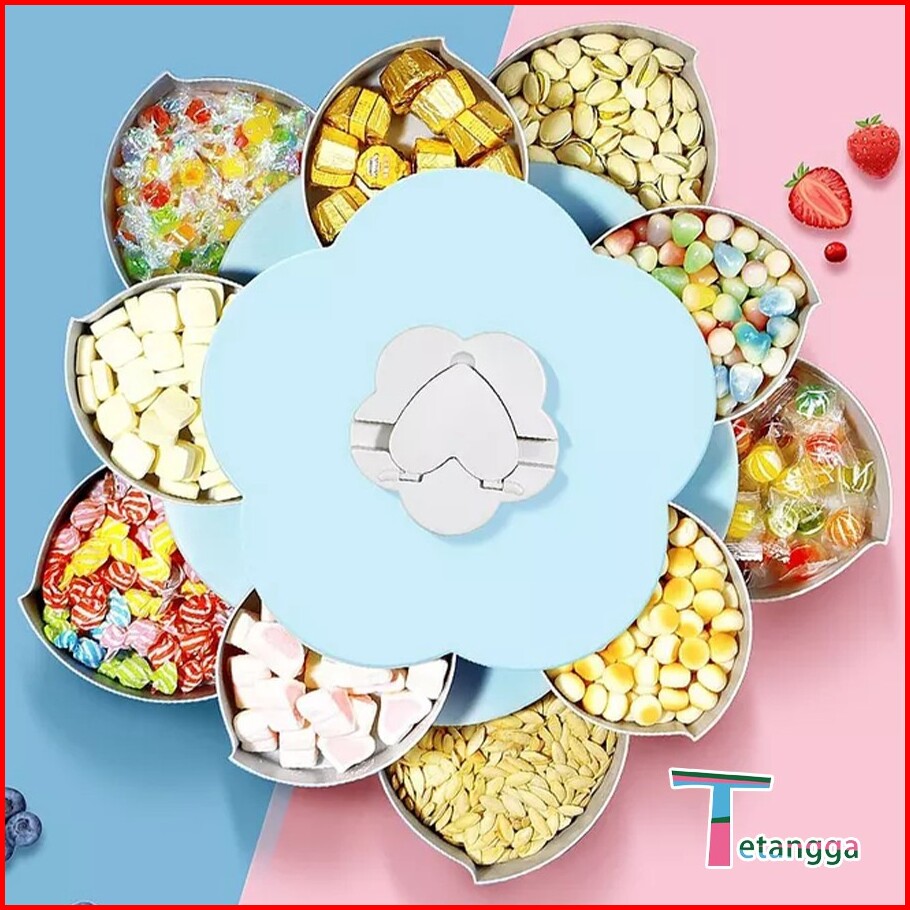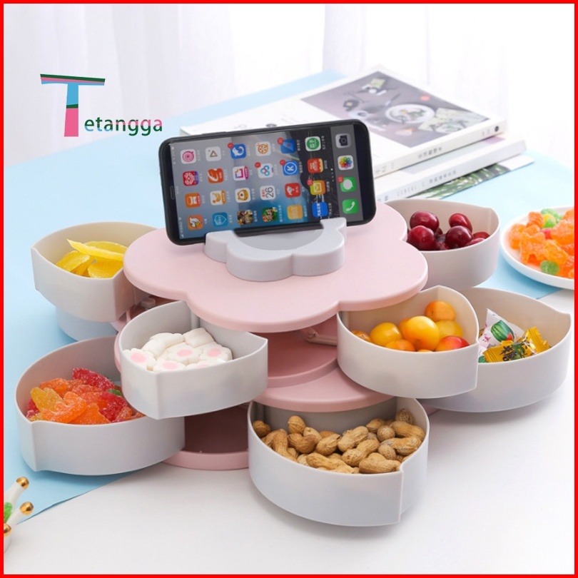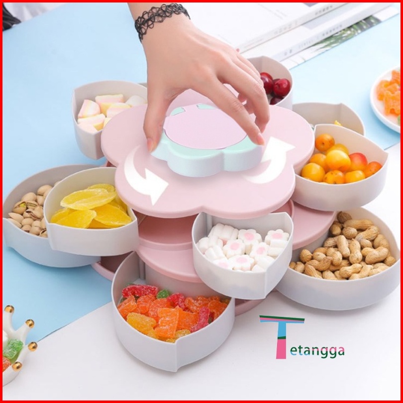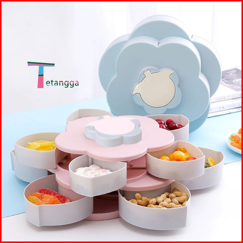 Toples Bunga Mekar Rotating Putar Kue Candy Snack Buah Tingkat 2 Susun Tempat Dudukan Storage Box
