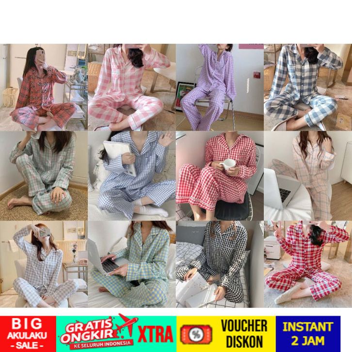 Baju Tidur Wanita Dewasa Piyama Import Pajamas Lengan Panjang Celana Panjang Kemeja PP Seri Kotak