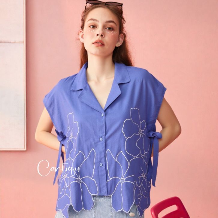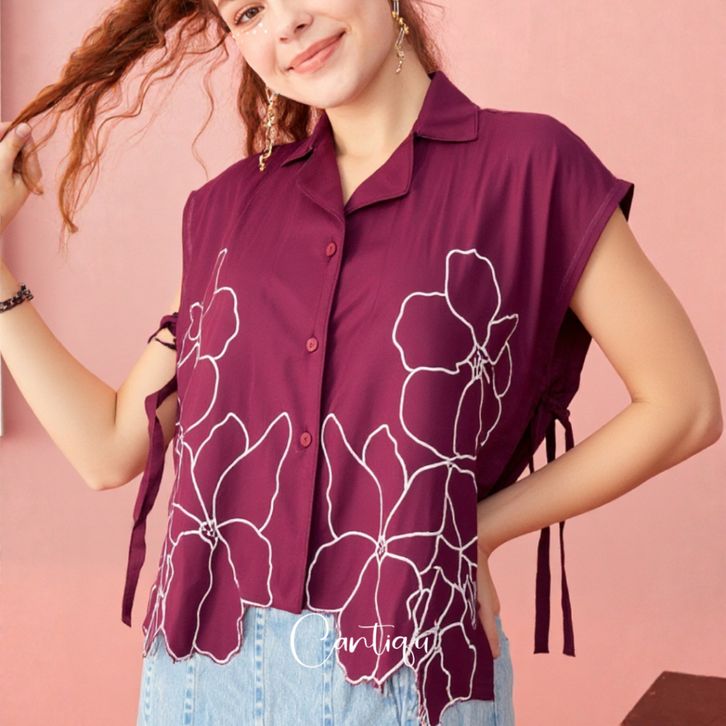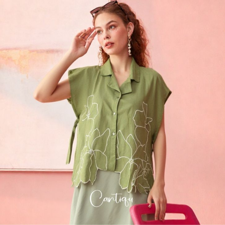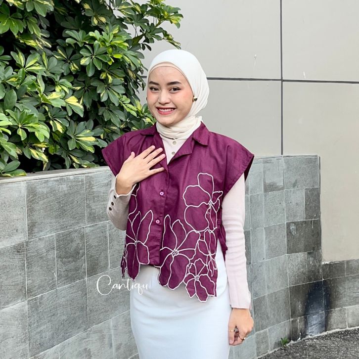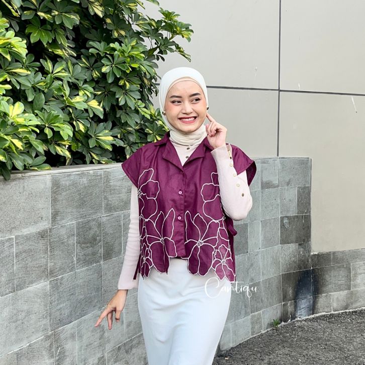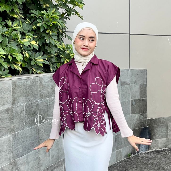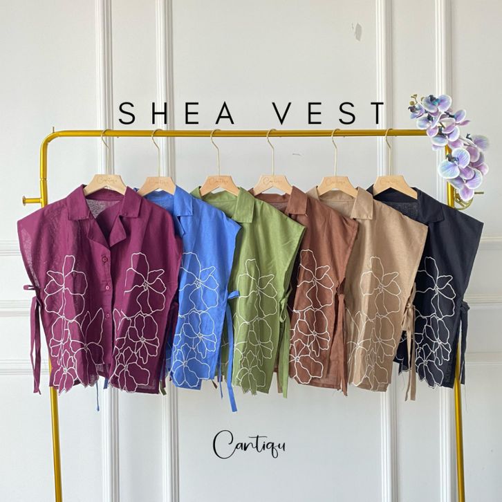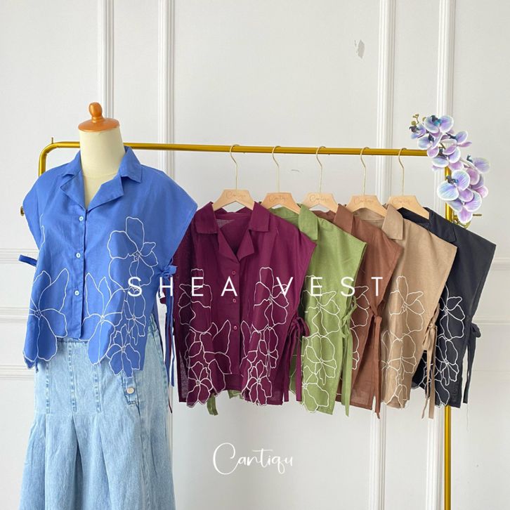 Shea Vest Wanita Linen Rami Bordir Bunga Kekinian Allsize Outer Casual Full Kancing Adjustable Samping