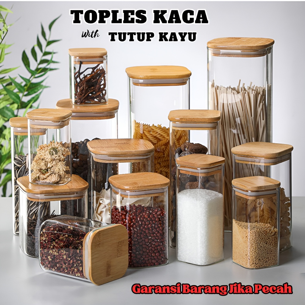 TOPLES KACA TUTUP KAYU JAR KEDAP UDARA ONE TWO CUPS TEMPAT PENYIMPANAN MAKANAN KUE KERING PERLENGKAPAN BUMBU DAPUR