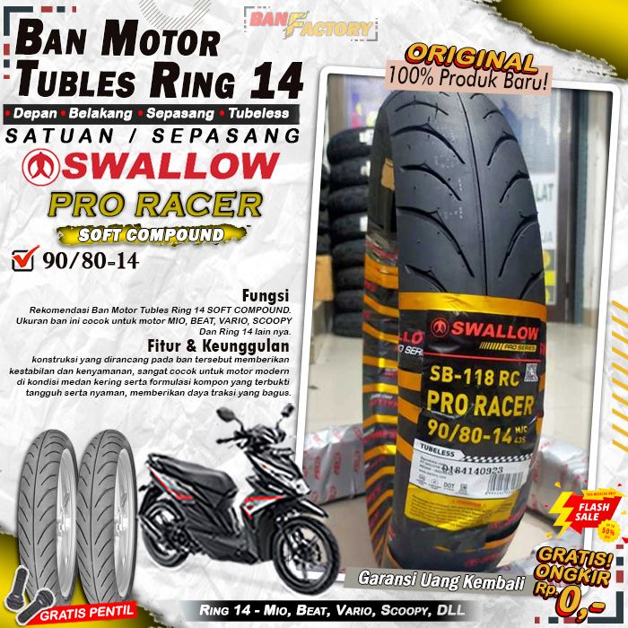 Sepasang Ban Motor Tubles Beat Swallow Pro Racer Ring 14 Ban Motor Tubeless Depan Belakang Beat Vario Scoopy Ring 14