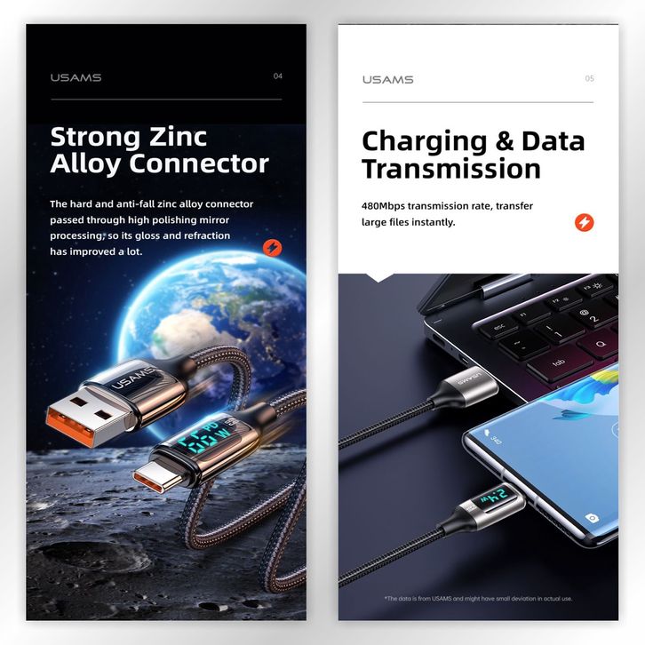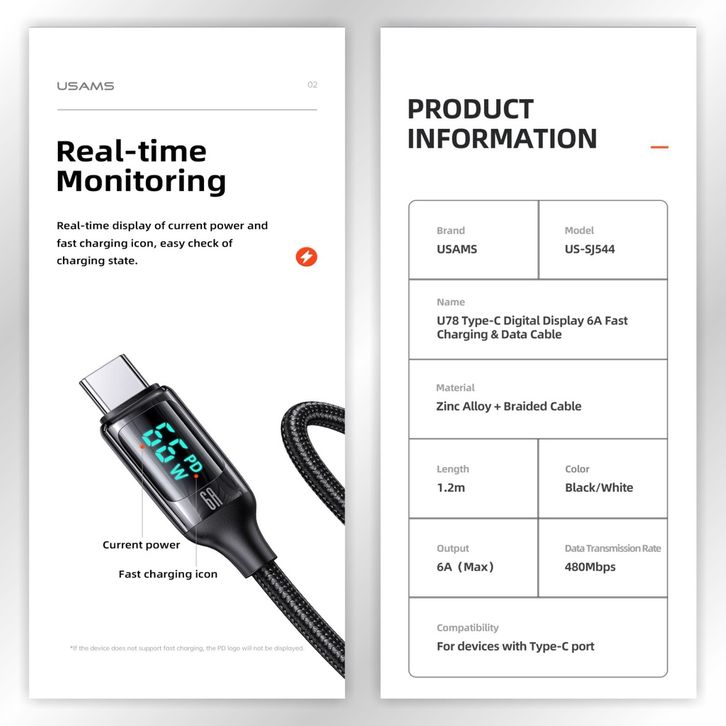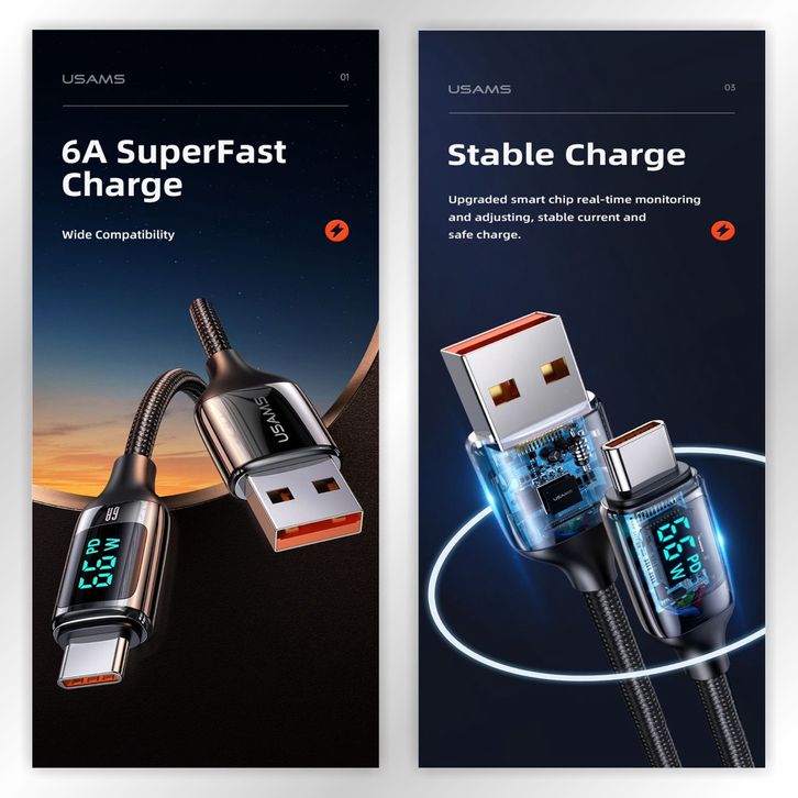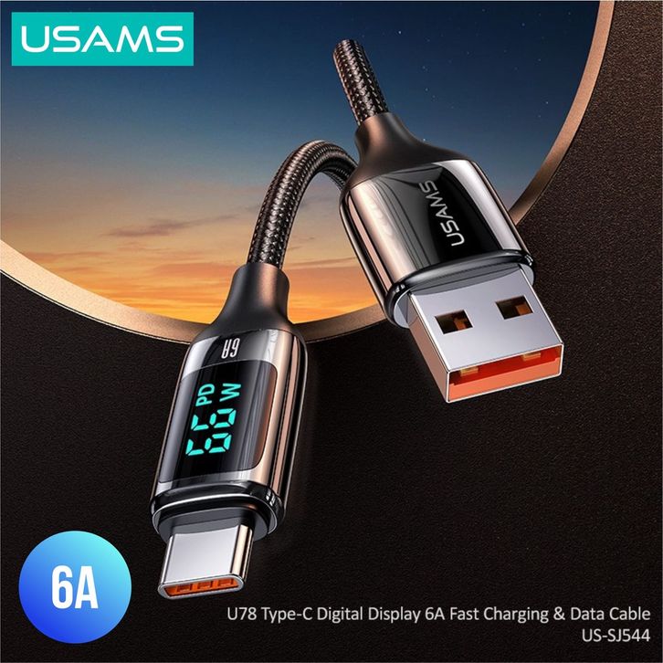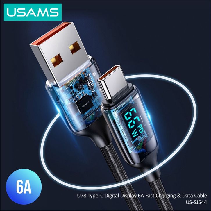 USAMS U78 Kabel Data Fast Charging 6A/66W Type C Digital Display