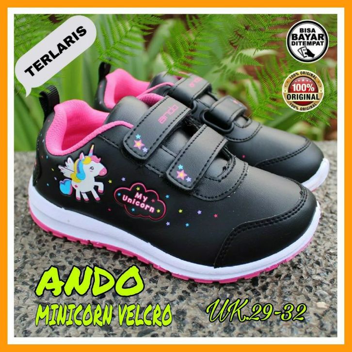 Sepatu Sekolah TK SD Anak Perempuan Cewek Ando Minicorn Velcro Perekat Tempel Original Asli Hitam Pink Size 29 sd 32 Kek
