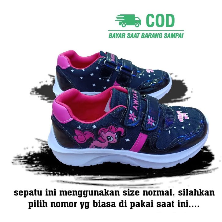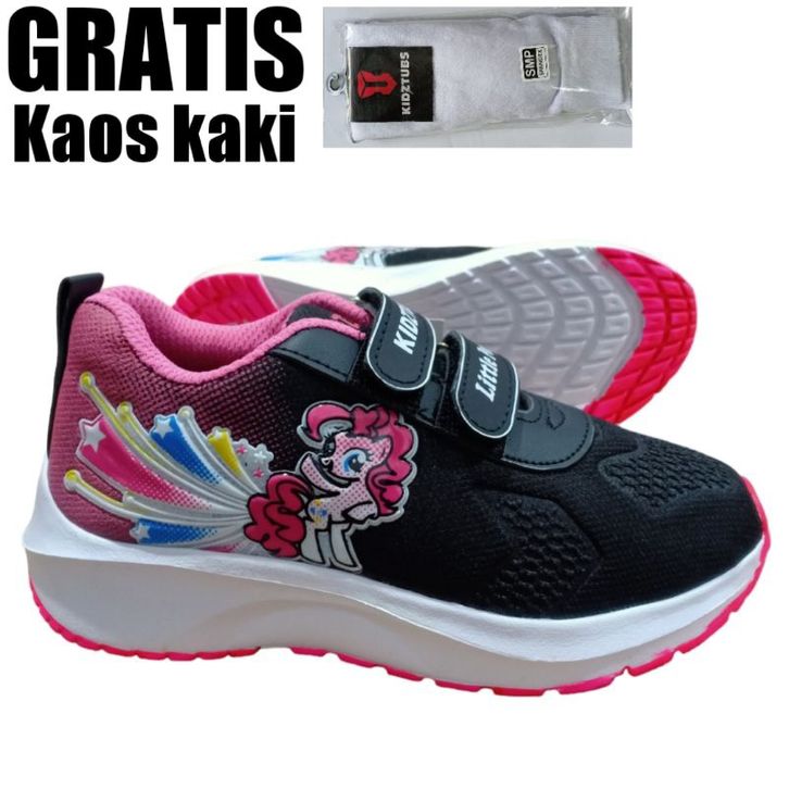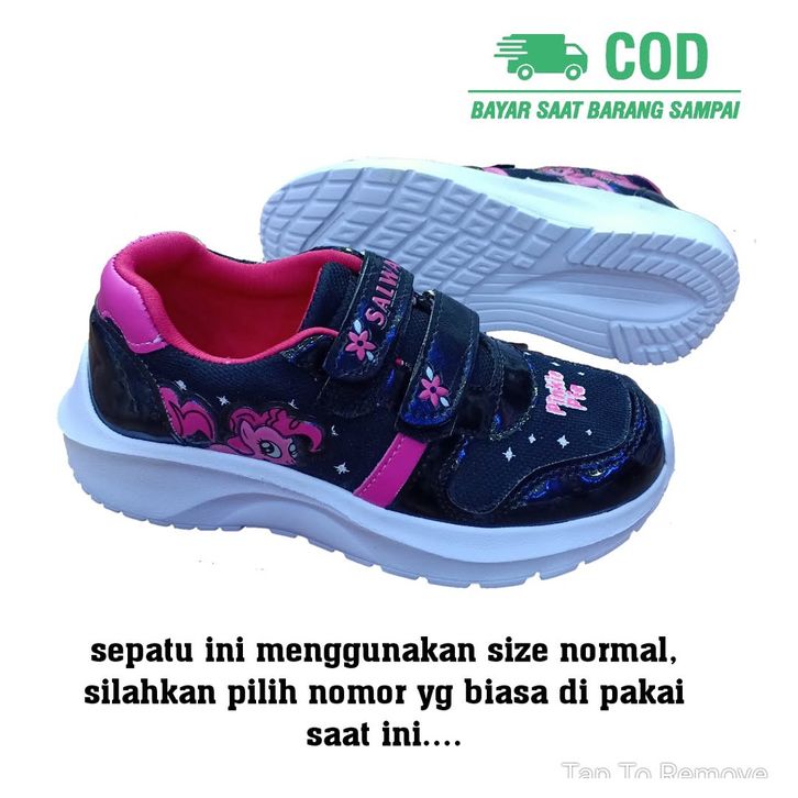 Sepatu Sekolah Anak Perempuan Karakter Kuda pony Cewek Cowok Warna Hitam Murah Tali Perekat Rekat Kecil Tanggung Umur Us