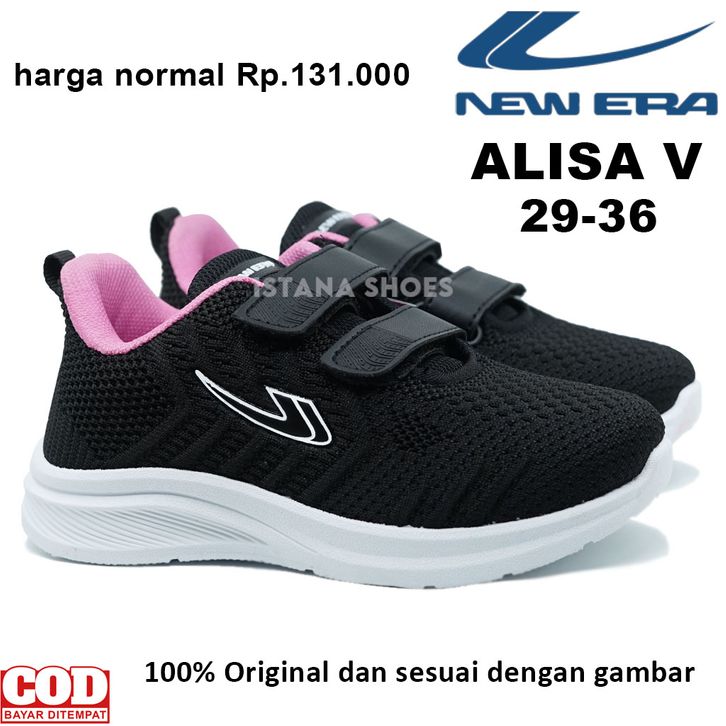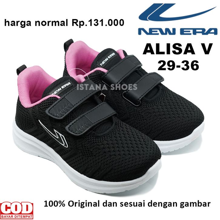 Sepatu Sekolah Anak Perempuan NEW ERA ALISA PAUD TK SD Hitam Pink Sneakers Perekat