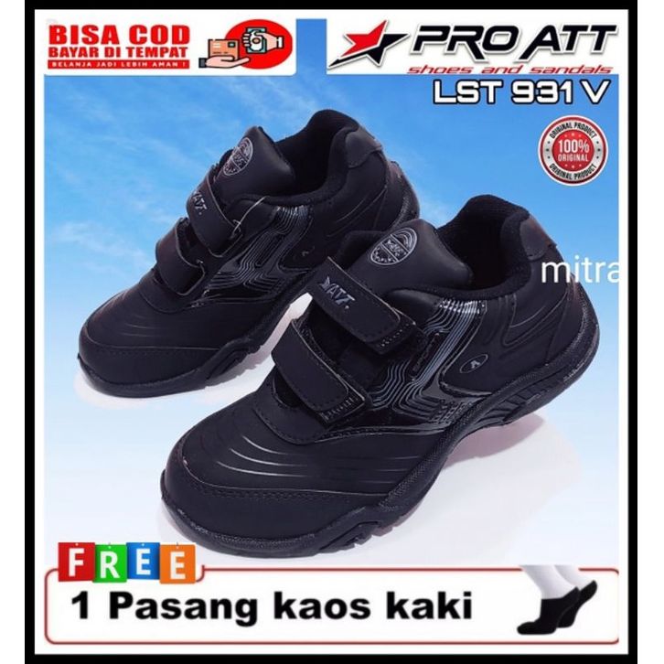 PRO ATT LST Sepatu Sekolah Anak Kecil Tanggung Cowok Cewek Hitam Tempel Perekat Original Murah Free Kaos Kaki - Size 30