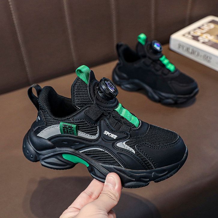 Sepatu Anak Sekolah Laki-Laki Hitam Sepatu Casual Sneakers Ringan Tombol Putar Mesh Running Shoes