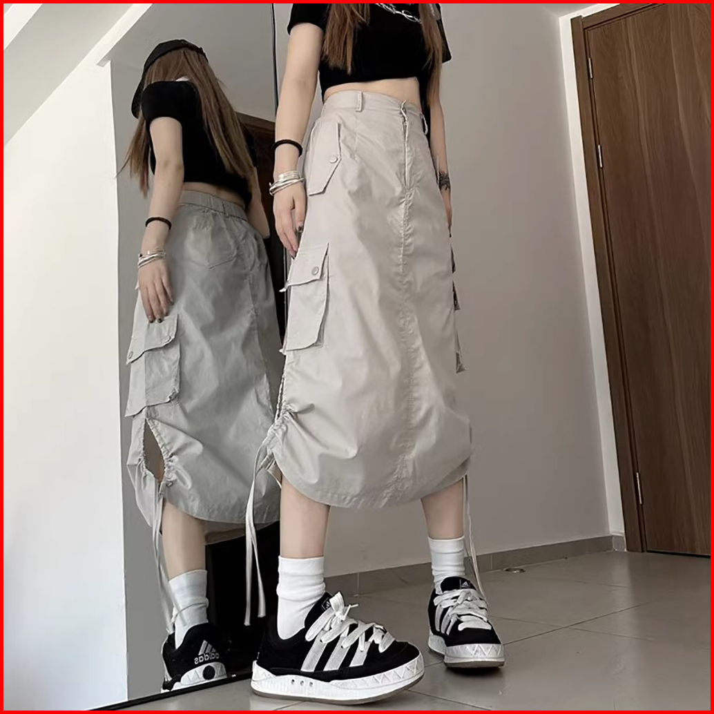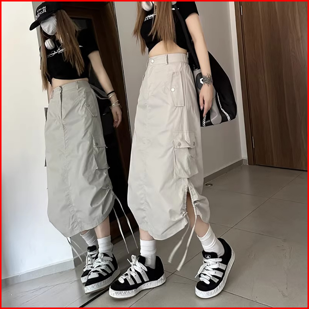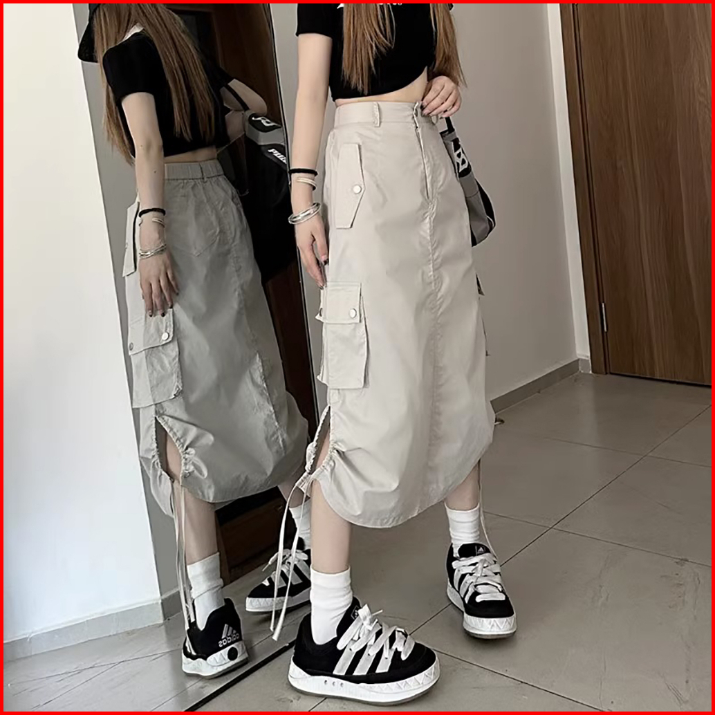 Cargo Skirt A-line Korea-rok Kerja Saku Besar Tali Serut Wanita-rok Maxi Denim Modis Pinggang Tinggi