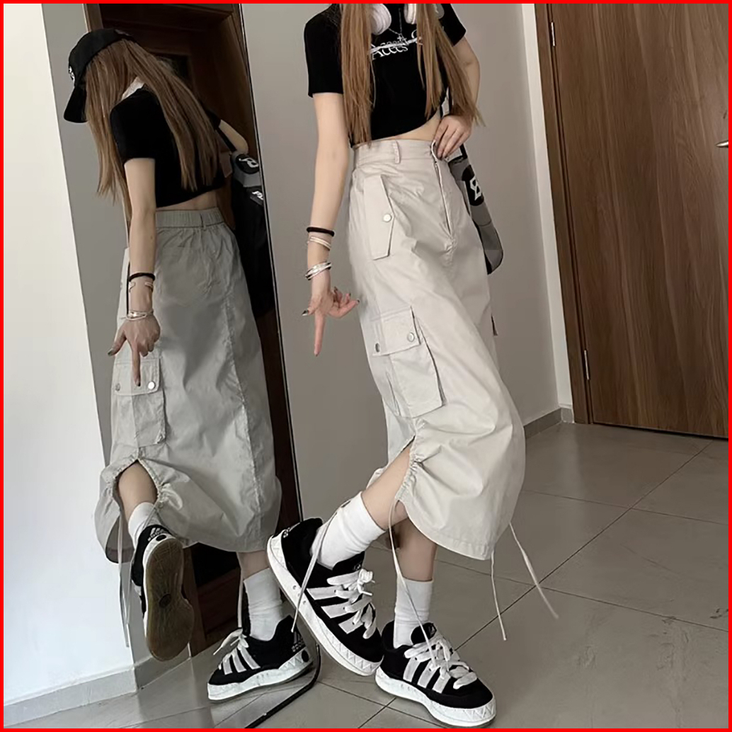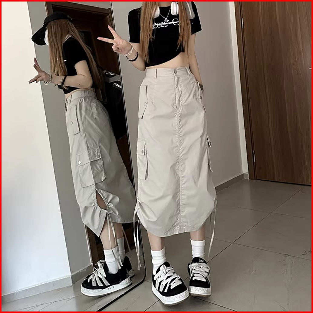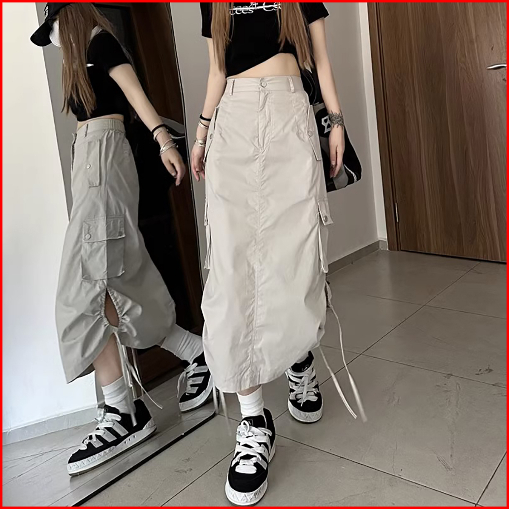 Cargo Skirt A-line Korea-rok Kerja Saku Besar Tali Serut Wanita-rok Maxi Denim Modis Pinggang Tinggi