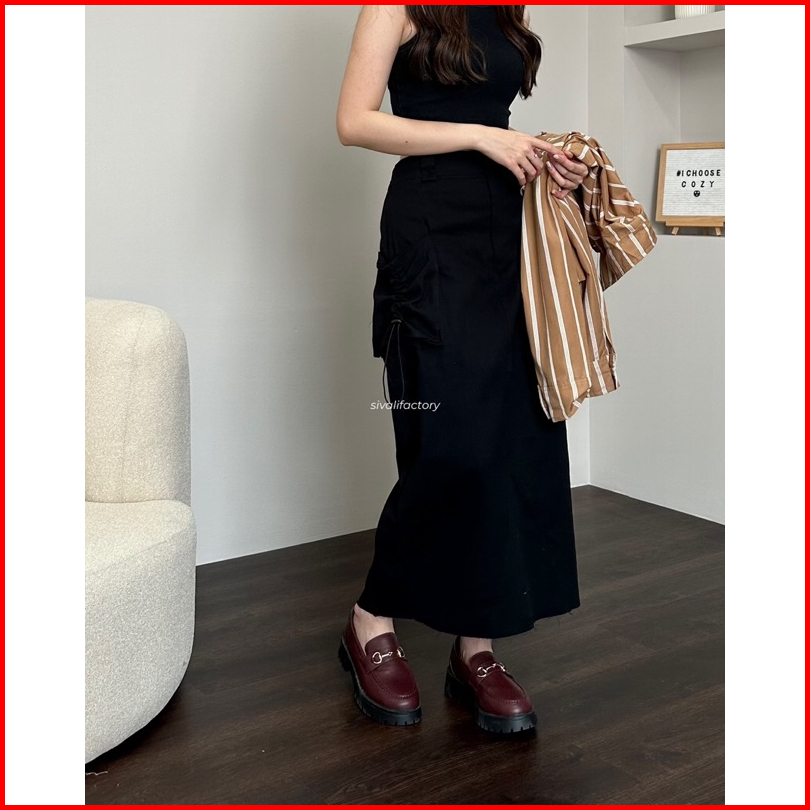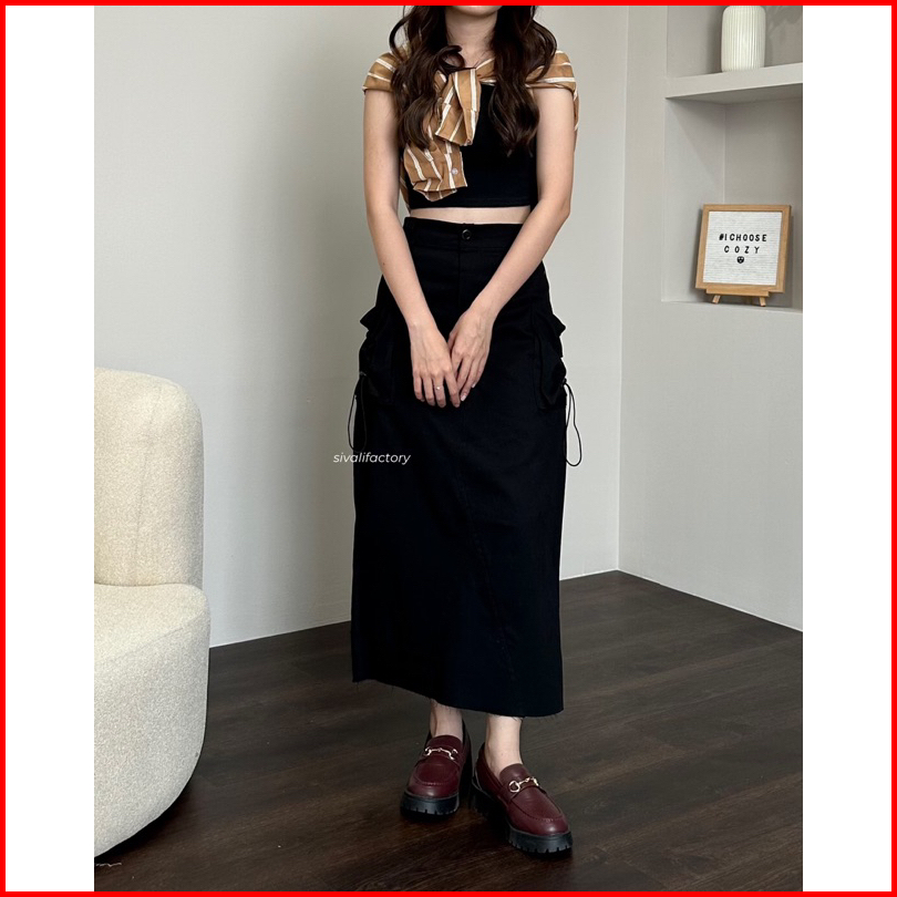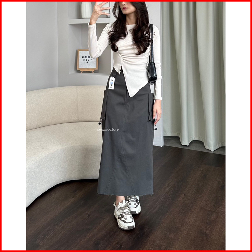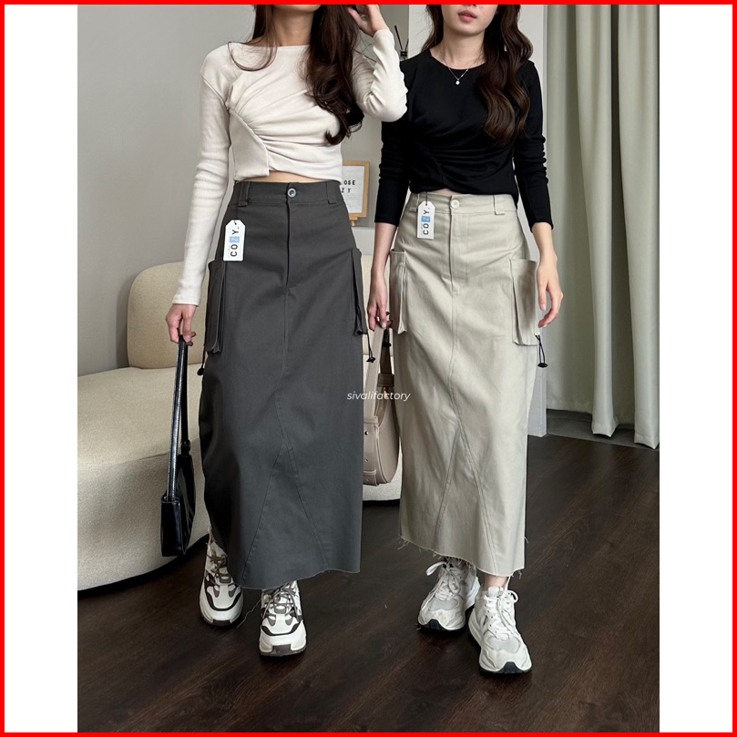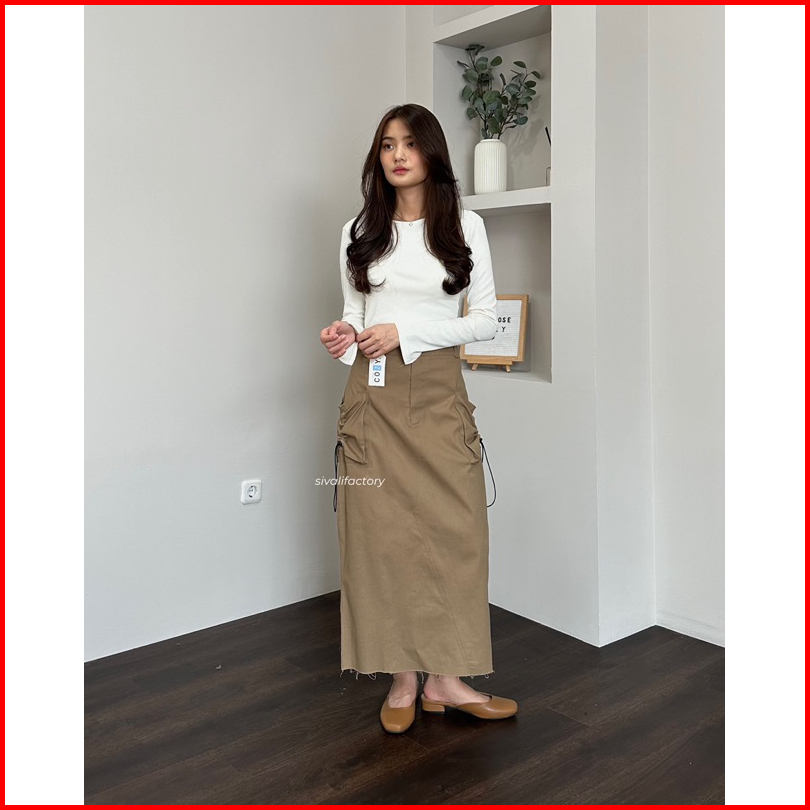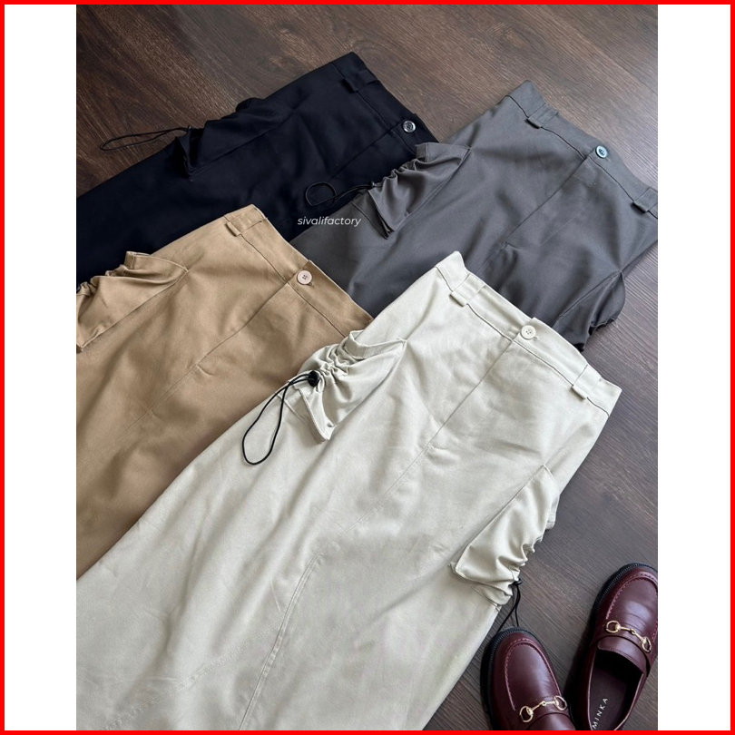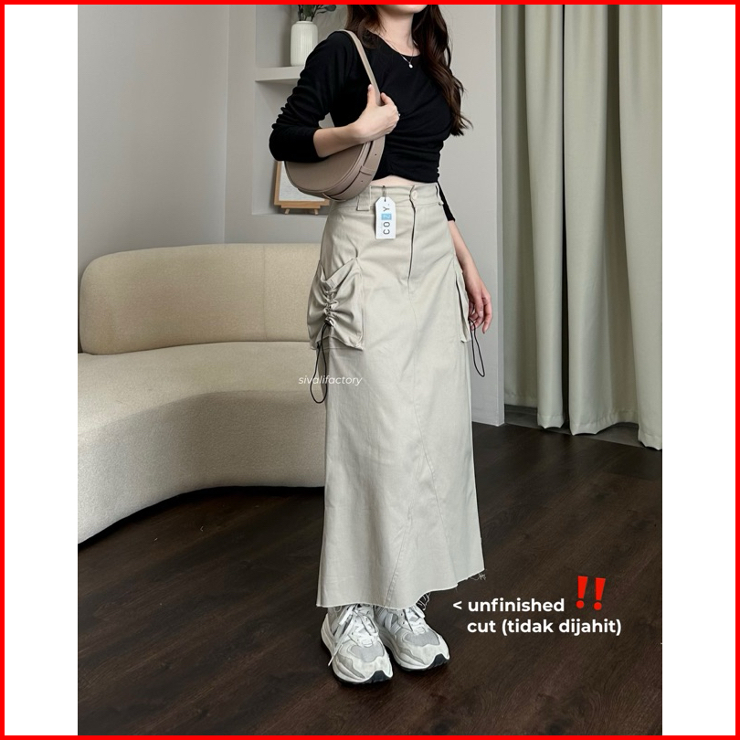 Sivali Milan Skirt - Rok Kargo Serut Wanita Pocket Long Skirt Maxi Panjang