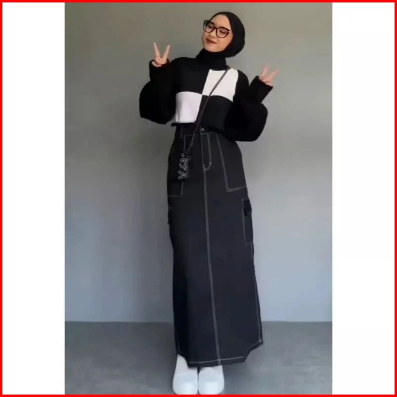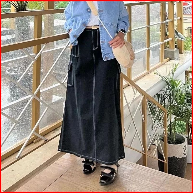 Rok Cargo List Jeans Highwaist Wanita Rok Kargo Span Panjang Obses Skirt Rok Cargo Casual Denim