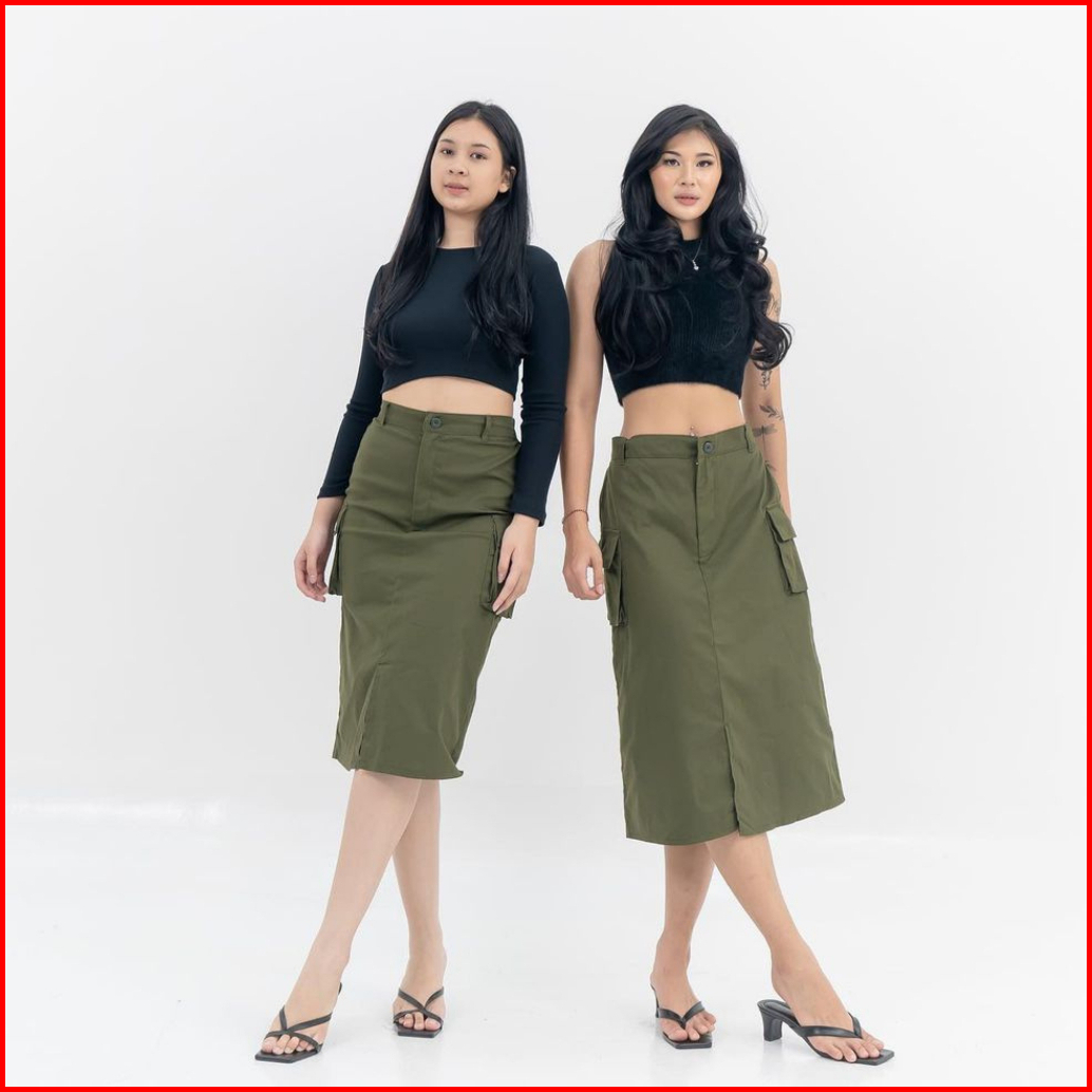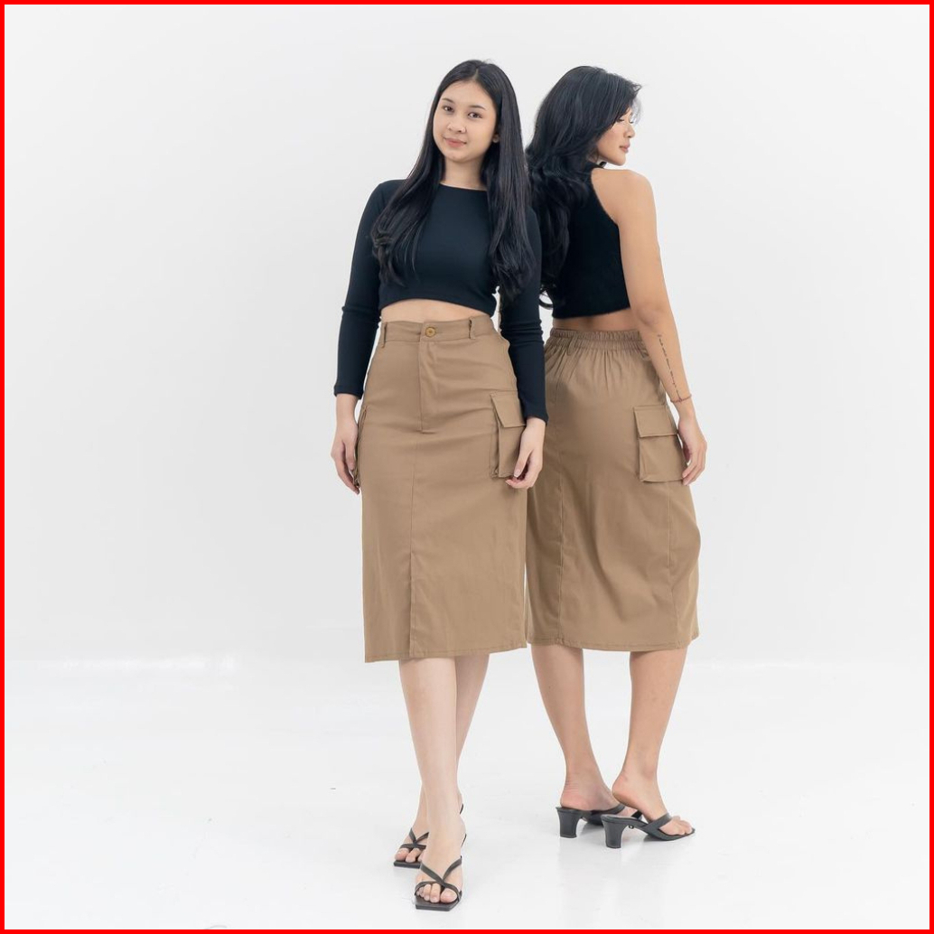 Skirt Cargo Midi Highwaist Rok Cargo Midi Drill Karet Belakang Rok Kargo