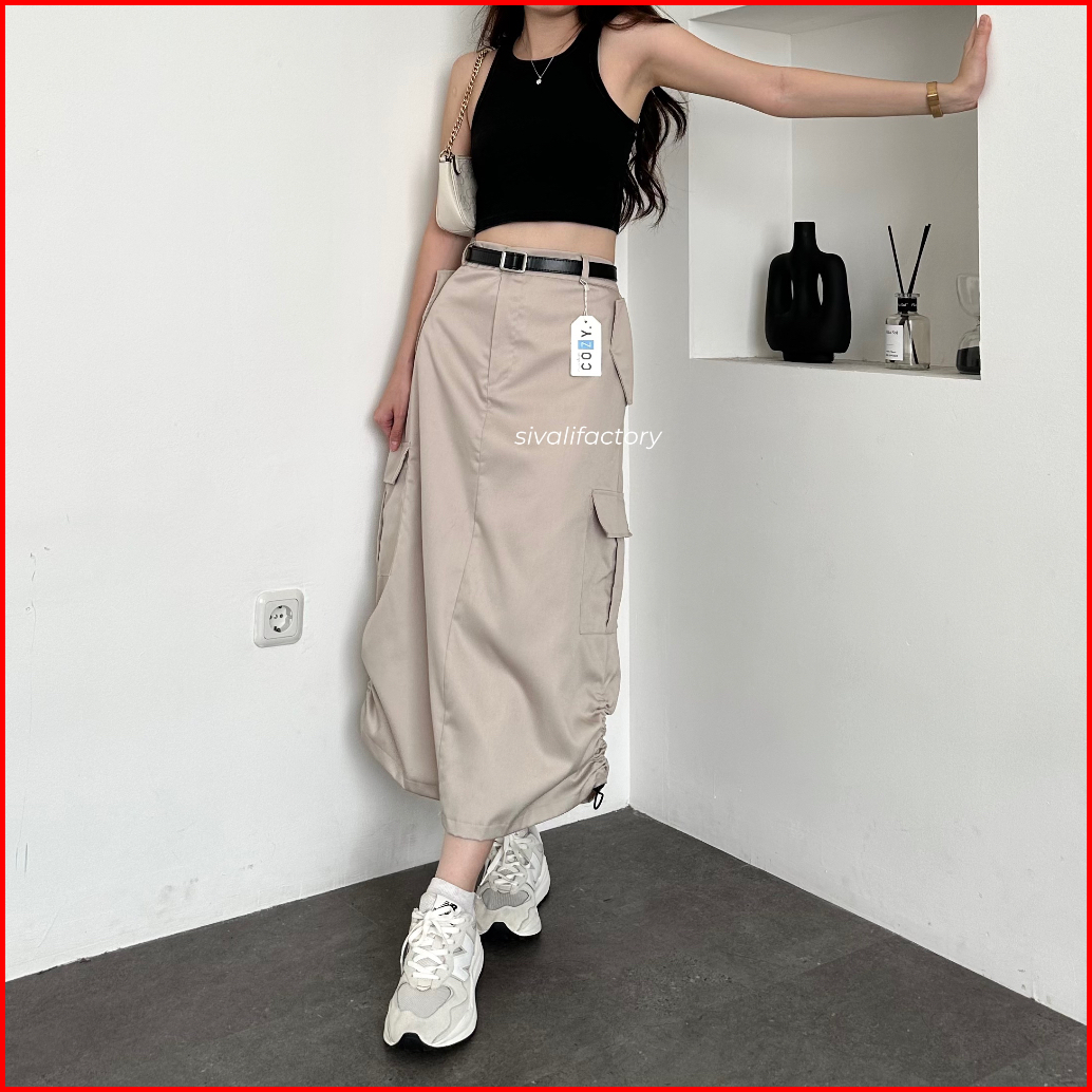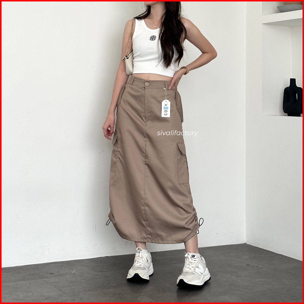 Sivali Taylor Cargo Skirt - Rok Kargo Serut Wanita Pocket Long Skirt Maxi Panjang