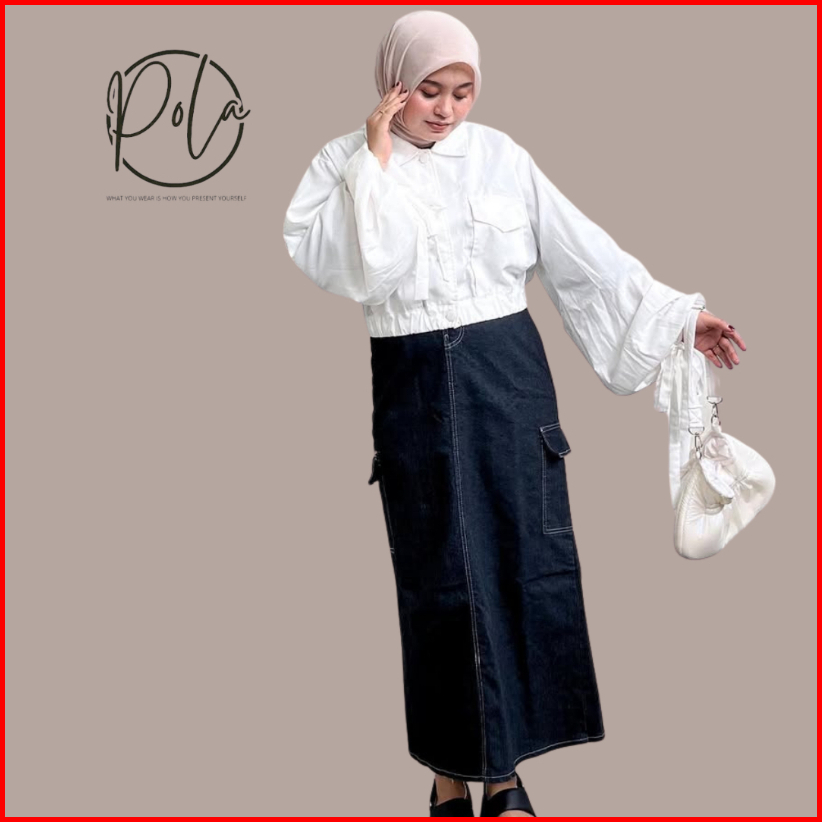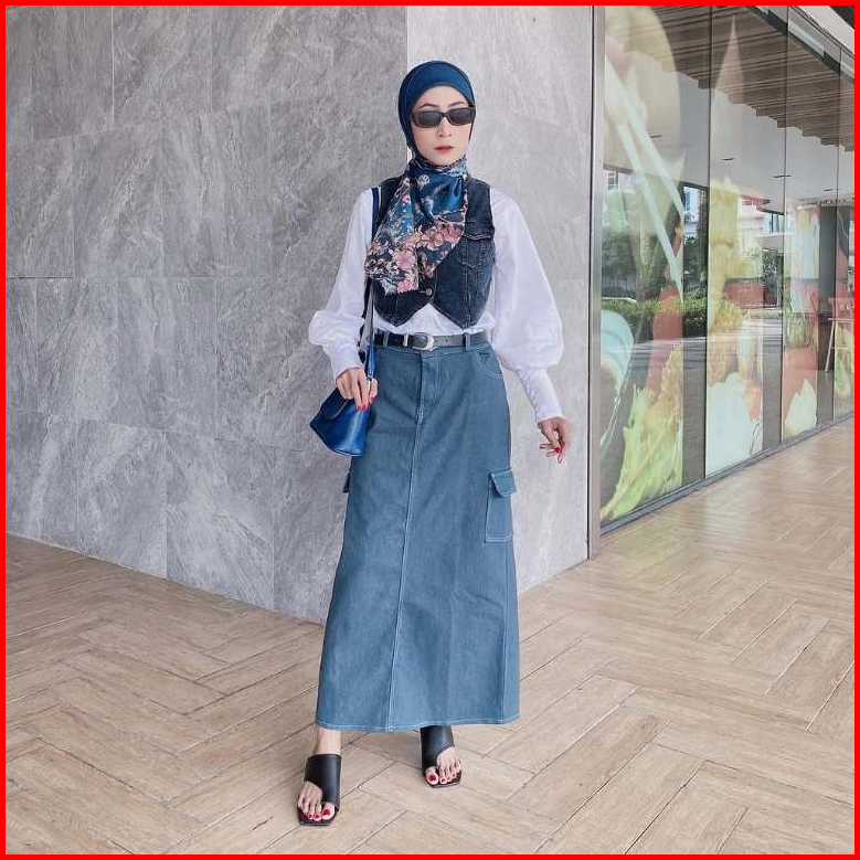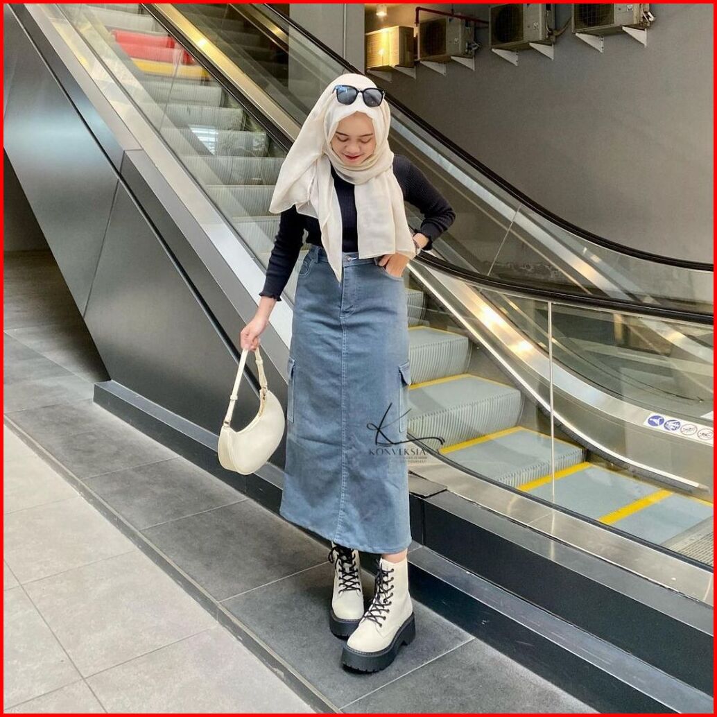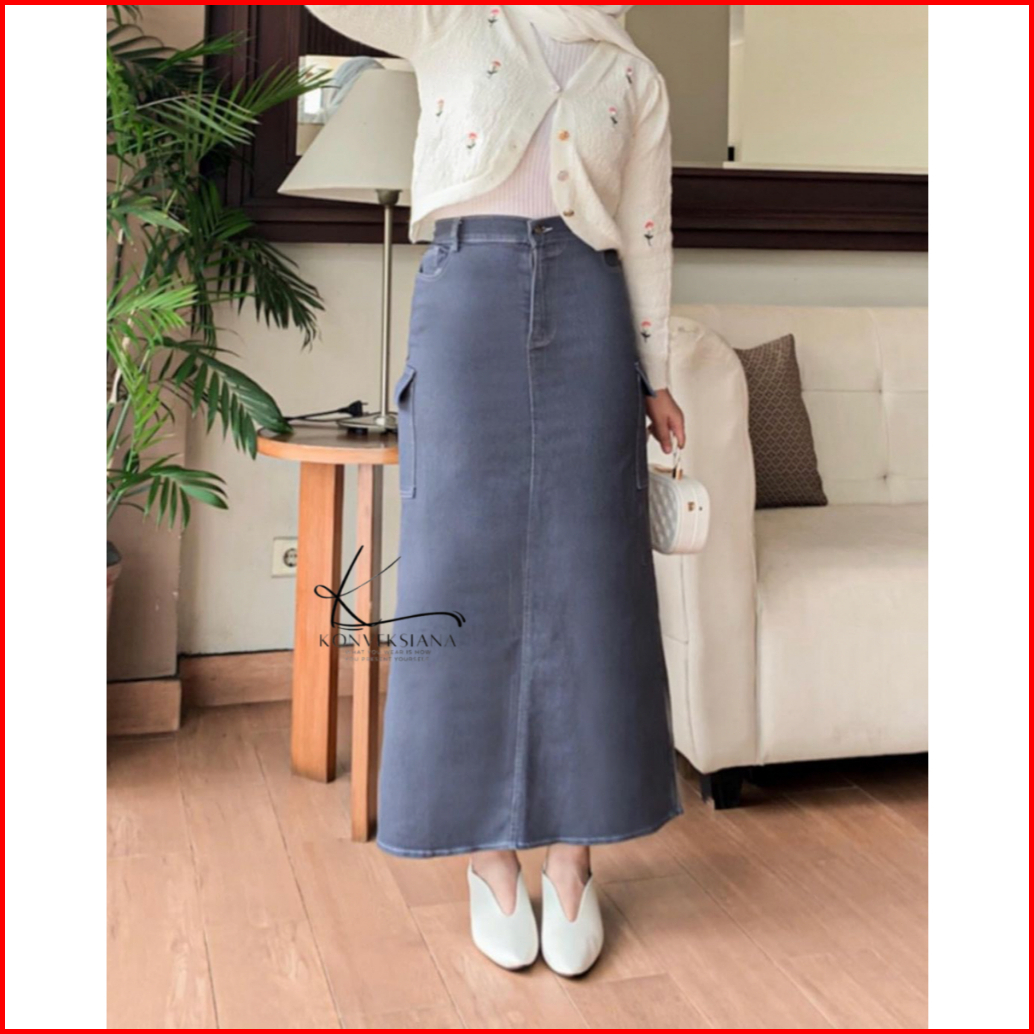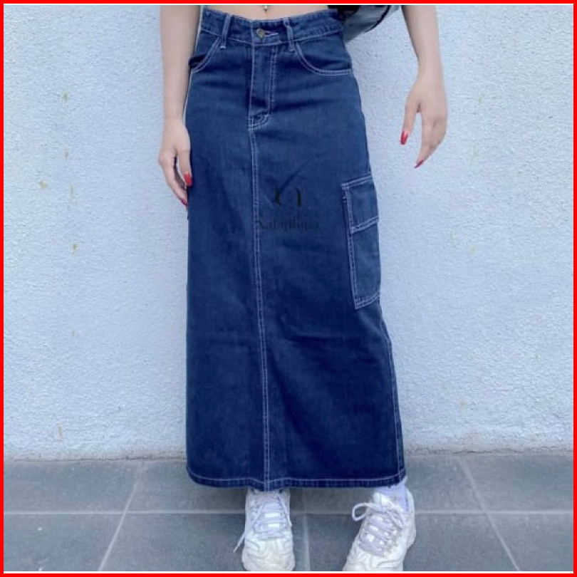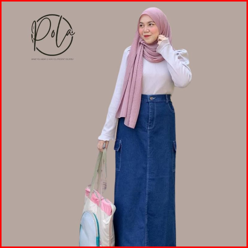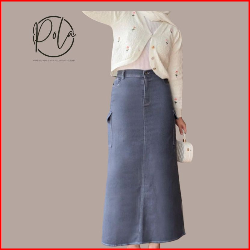 Pola Wear Lyra Cargo Skirt Rok Panjang Span Higtwaist Jeans Denim Tebal Wanita