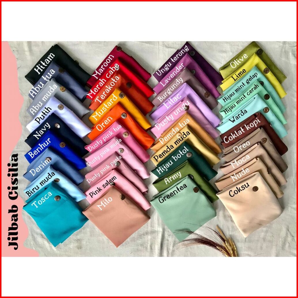 hitam, putih, navy, denim, pink pasta, pemda, ungu terong/ungutua, pink tua, pink muda, greentea, oreo, merah cabe, abu muda, abu tua, salem, hijau mint cerah, wardah, mustard, coksu, army, nude, moka, milo, maroon, dusty ungu, burgundy, lime, hijau botol, cokpi/coklat pramuka, lilac, pink salem, biru muda, magenta/lavender, toska, old jeans, pemda muda, terakota, olive, benhur, Orange
