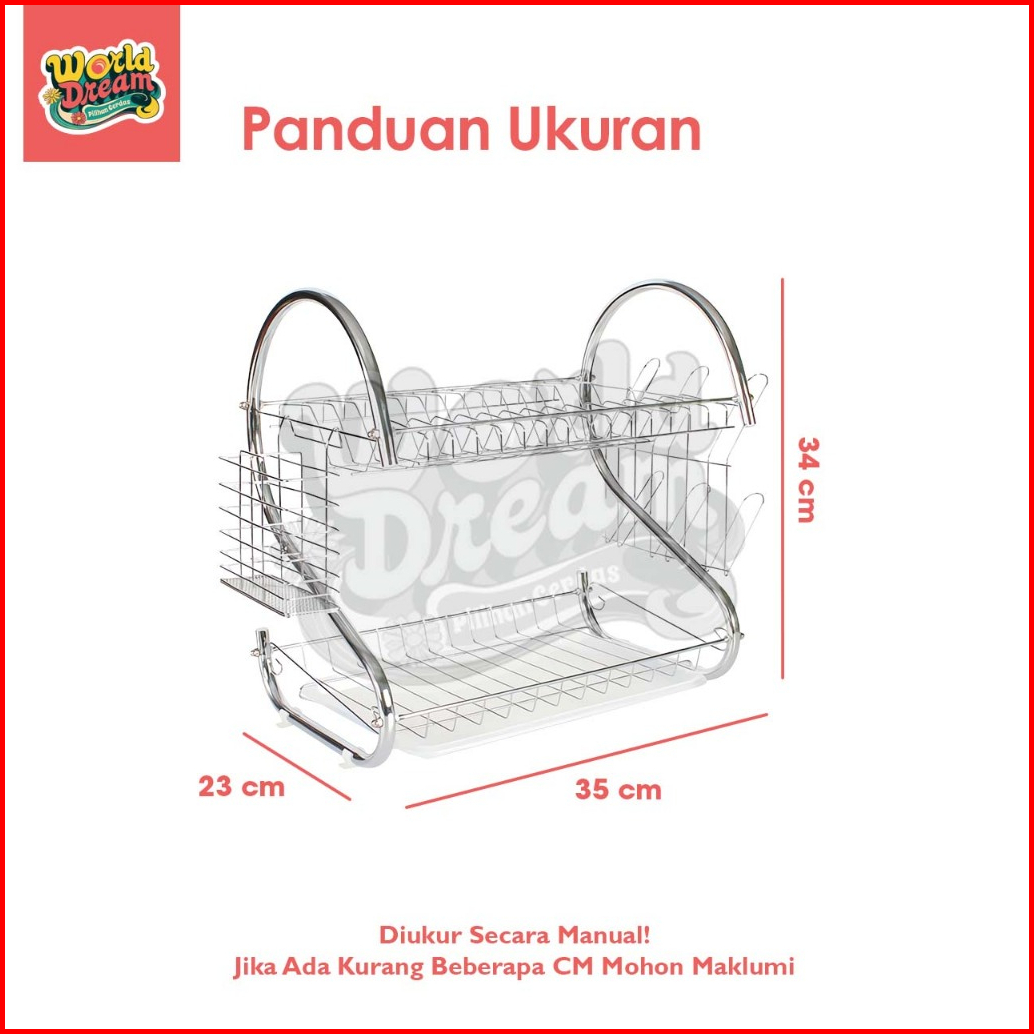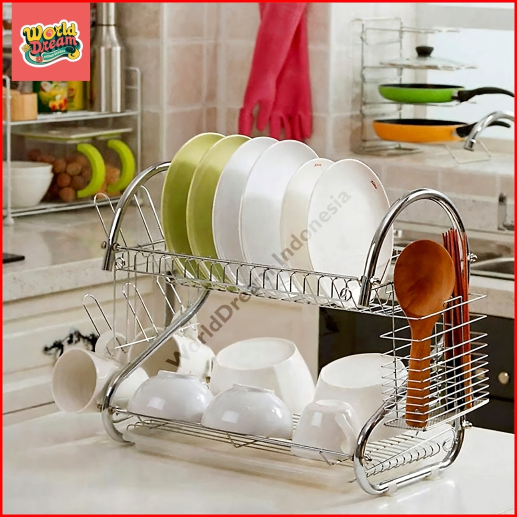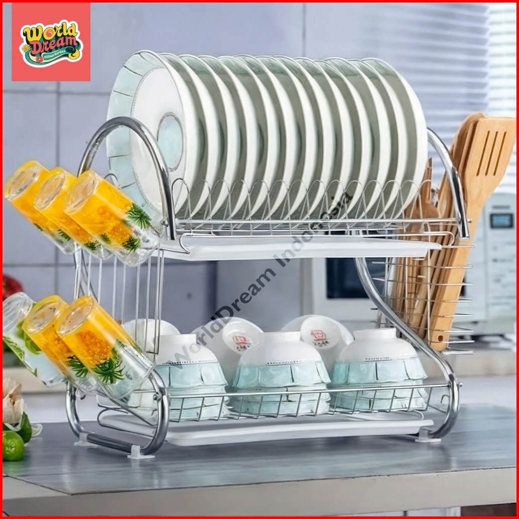 Worldream Rak Piring Stainless 2 Tingkat Rak Dapur Gelas Rak Sendok Rak Serbaguna Rak Piring Kost