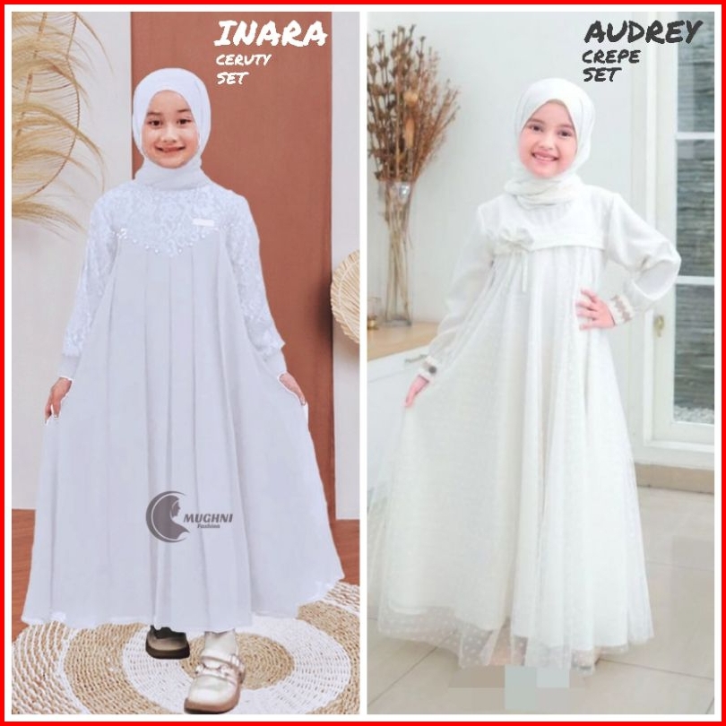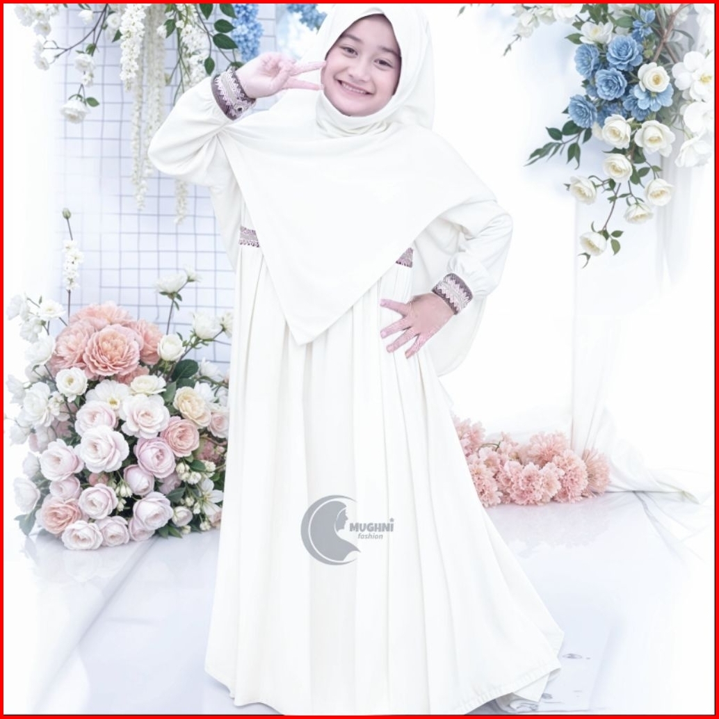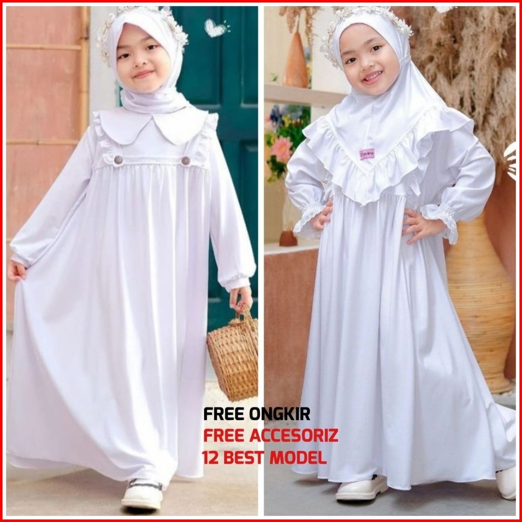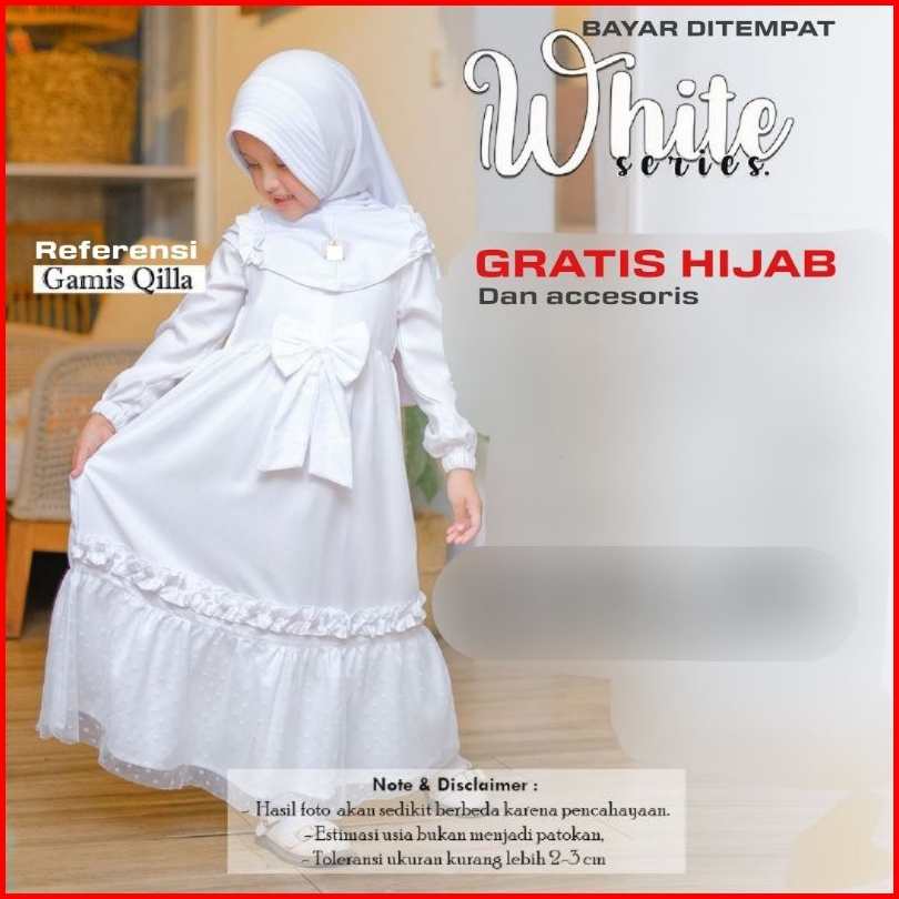 Misya Audrey Gamis Anak Set Hijab Bisa Couple Putih Anak Perempuan 1-13 Tahun Manasik Lebaran 2025