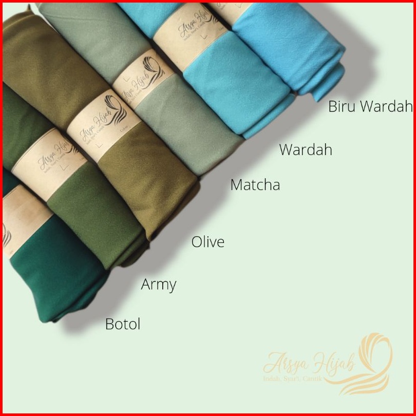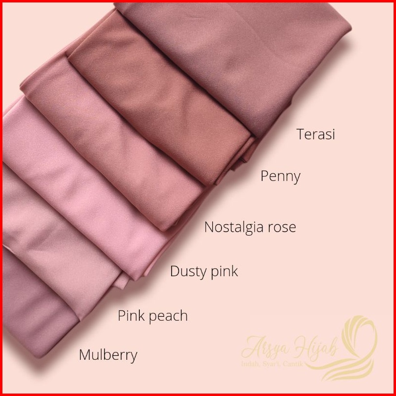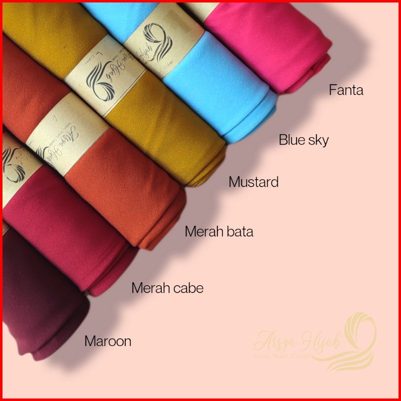 maroon, Merah cabe, Mustard, botol, Hijau Tua, Hitam, navy, silver, broken white, Putih, Pramuka, Khaki PNS, nostalgia rose, mulberry, soft purple, Dusty purple, Matcha, Coksu, Olive, Mocca, Grey, Pink salem, Taro, Blue sky, Hijau wardah, Tan, Merah Bata, Terasi, Latte, Lilac, Cream, Dark grey, Cinnamond, Dusty Pink, Caramel, Plum, Lavender, Denim, Soft milo, Walnut, Pink Peach, Khaki, Fanta, Lime, Merah, Kuning, Random